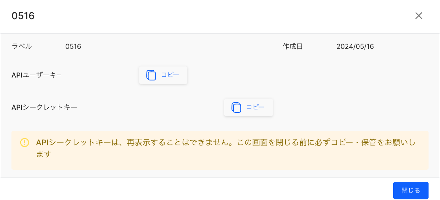 ⚠️ 「APIシークレットキー」は再表示が出来ないため、必ず保管をお願いいたします。