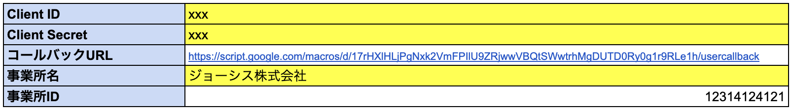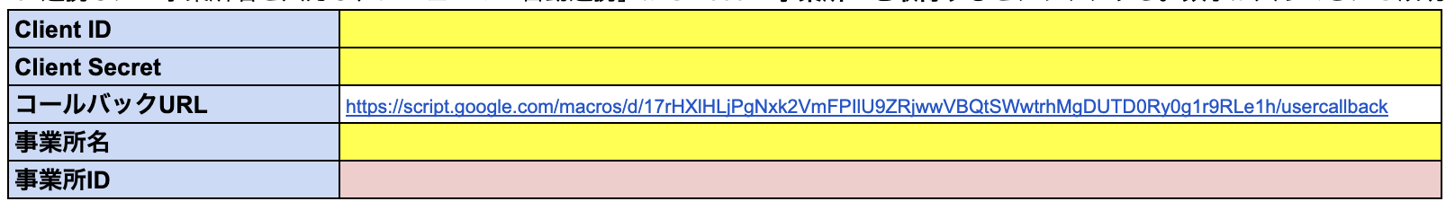 Client IDとClient Secretを、スプレッドシート上の該当セルにそれぞれ貼り付けます。(アプリケーションを作成する方法)
