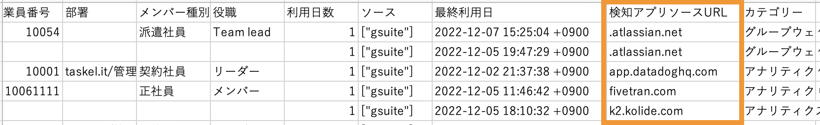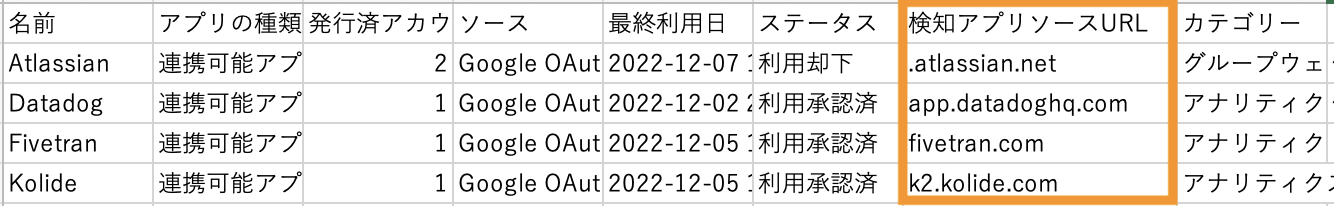 アカウント詳細を含む検知アプリ一覧CSV: