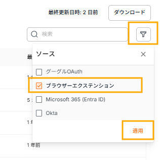 - 右上にあるフィルターボタンをクリックし、「ソース>ブラウザーエクステンション」を選択してください。