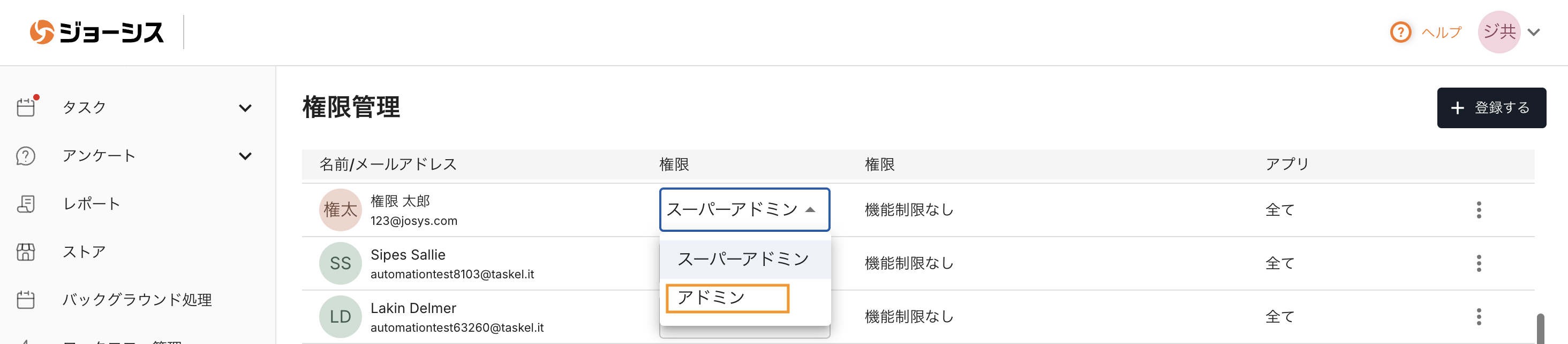 - 連携を行いたいアプリの特権管理者の権限を持つユーザーをJosysに招待し、連携を行います。