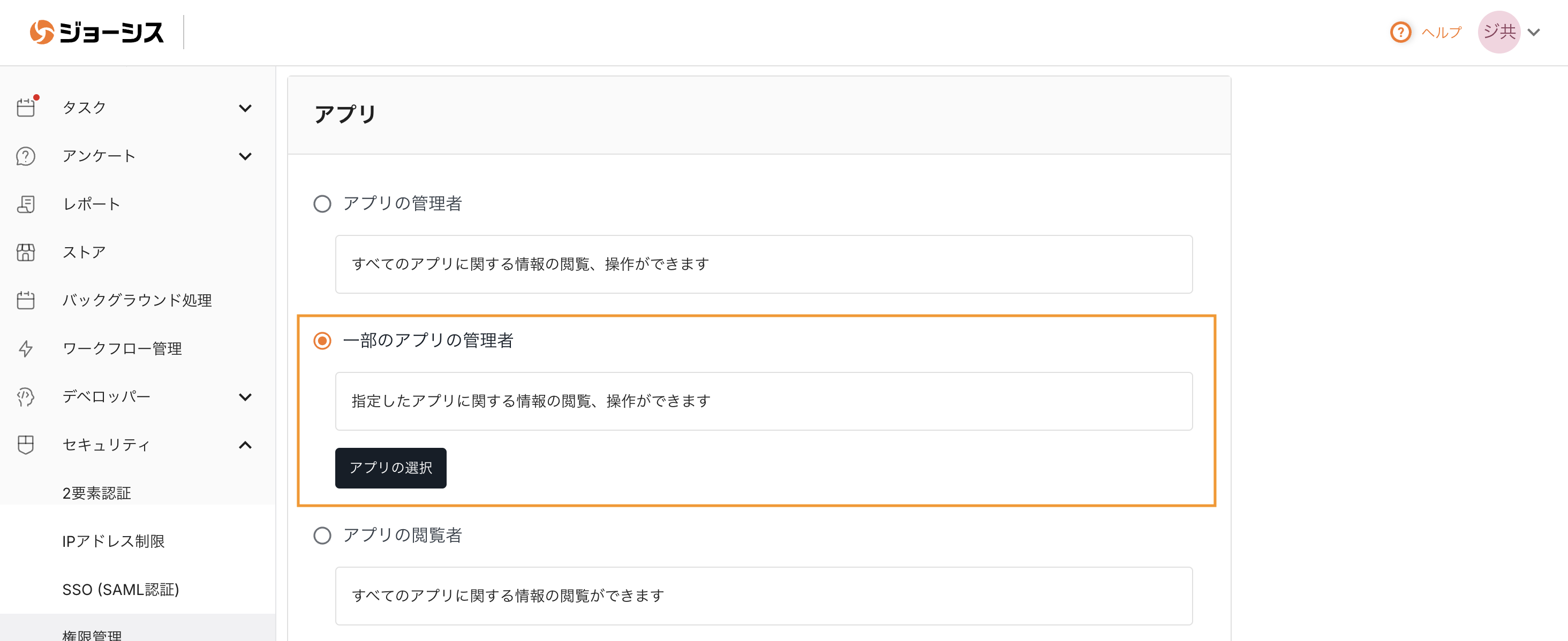 不要な権限が付与されないよう招待を行なったユーザーの権限を対象のアプリに限定します。