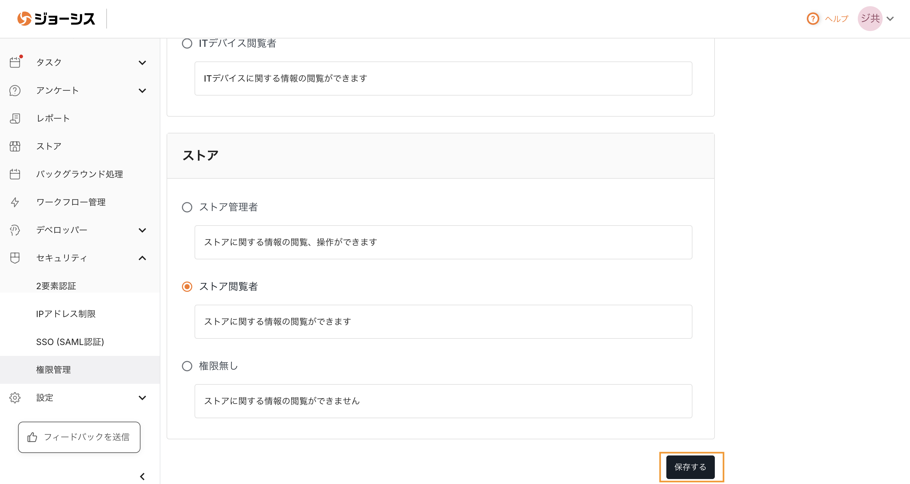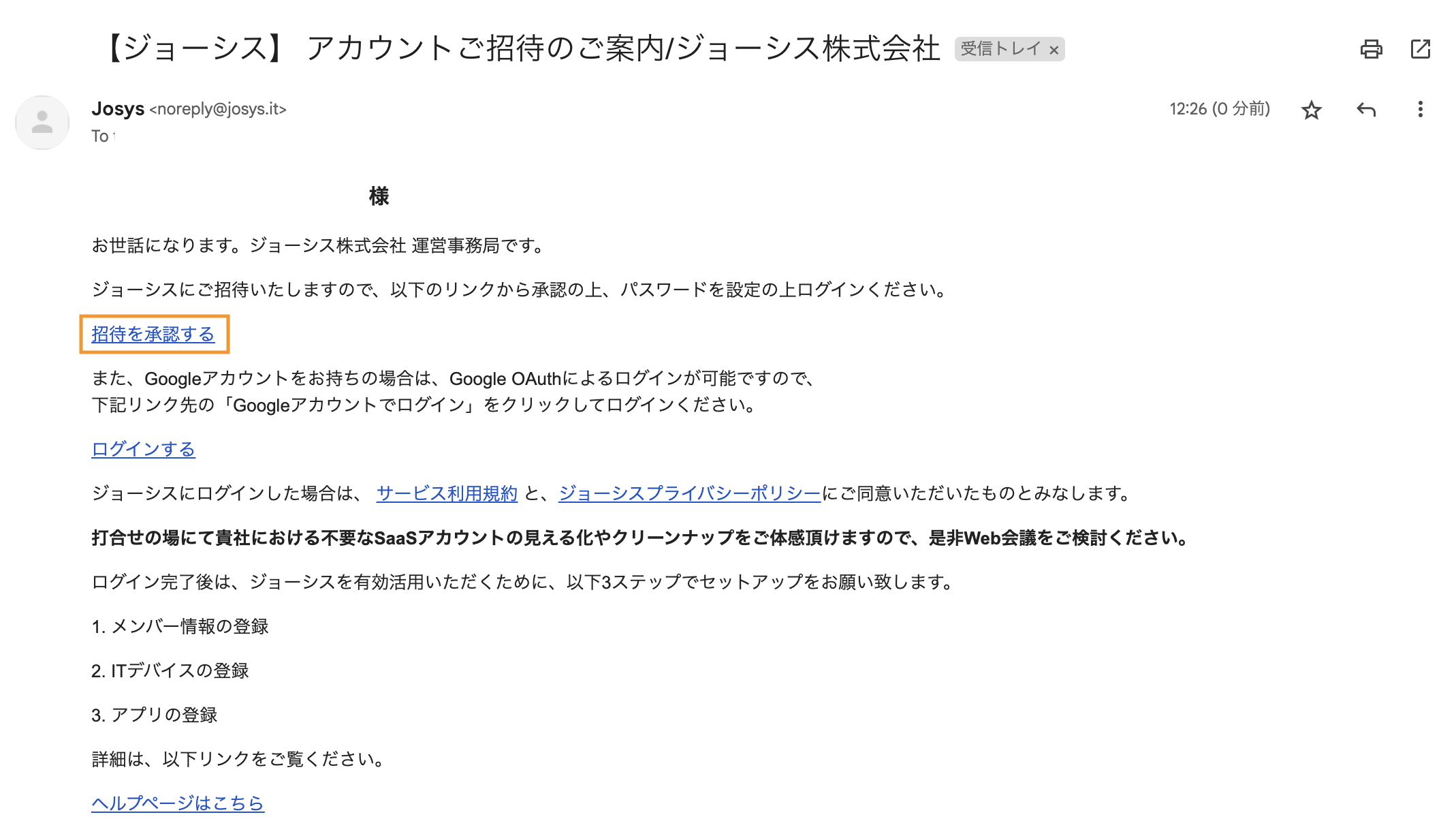 JosysのIT管理者にて管理者として招待を行うユーザーの権限設定を行い、IT管理者として招待しアプリ連携を行います。