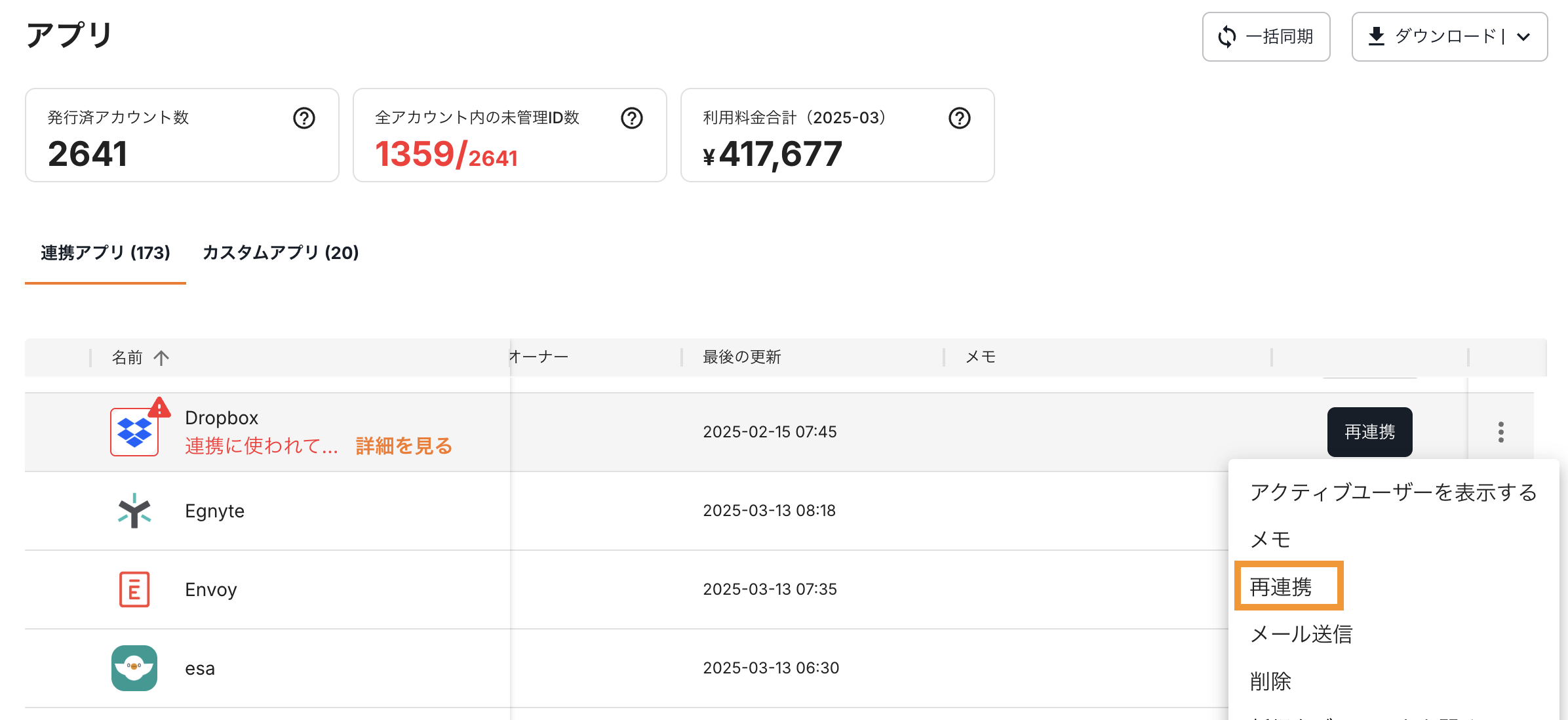 - 既存のアカウント一覧や、紐付けIDは残したまま、再連携を行っていただけます。