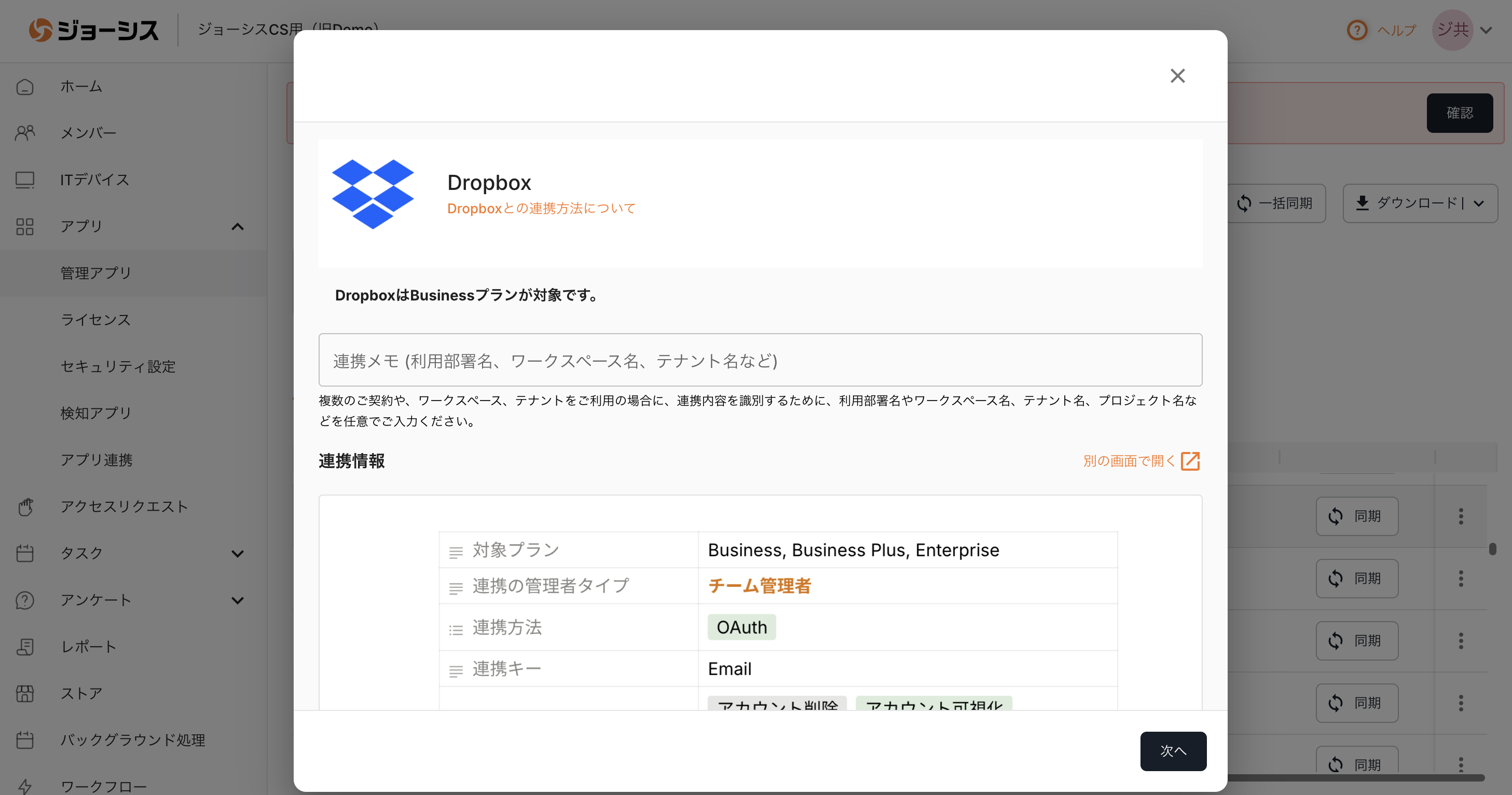 ⋮から削除をクリックすると、アプリとの連携を削除できます。⚠️Josys上のプロビジョンの履歴も削除されます。ただし、SaaS側のアカウントに対する影響はございません。