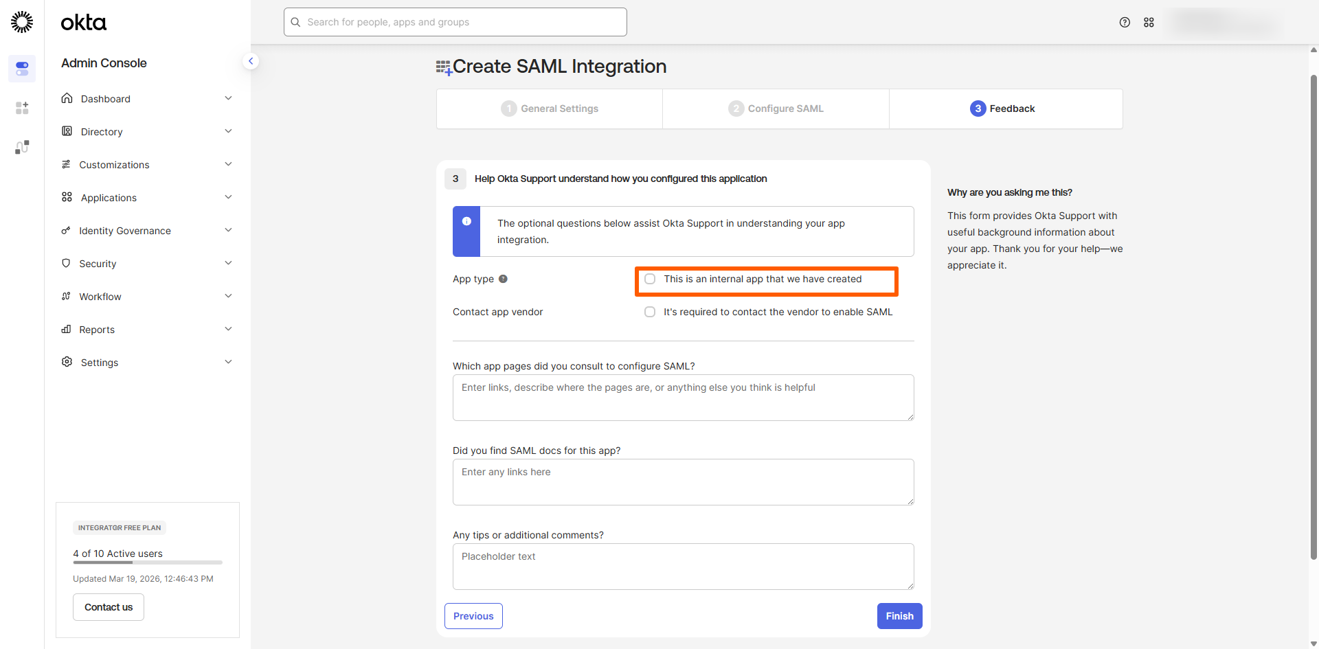 Nextをクリックします。 - Feedback画面にて、App type:This is an internal app that we have created を選択してください。