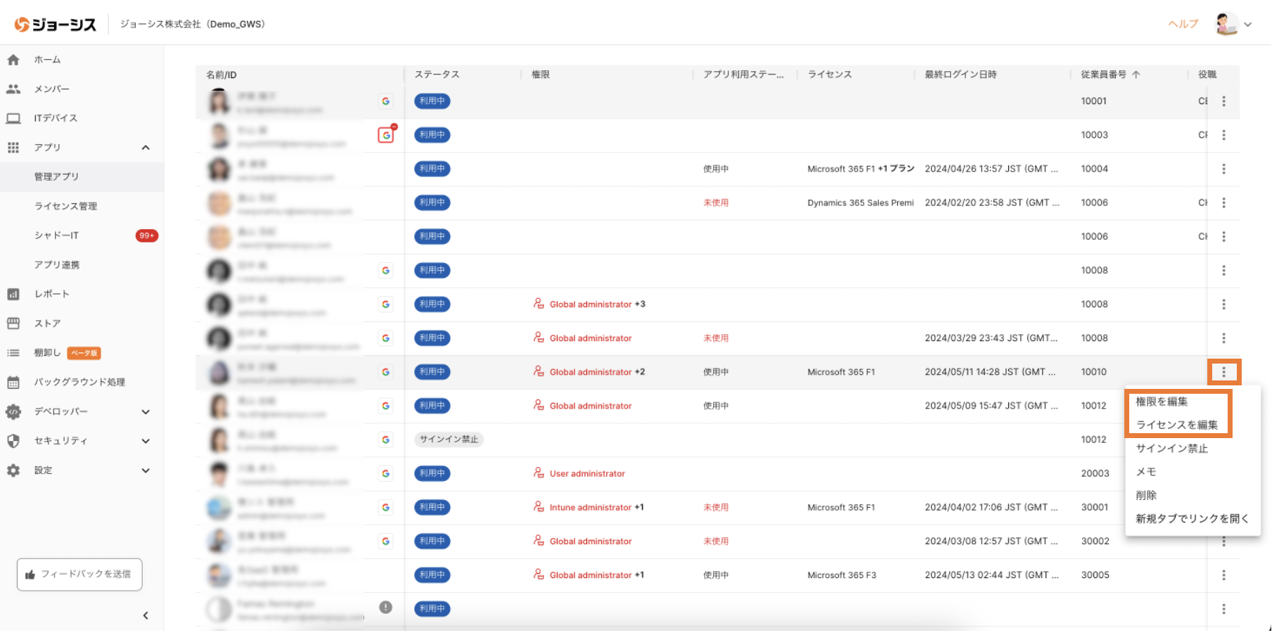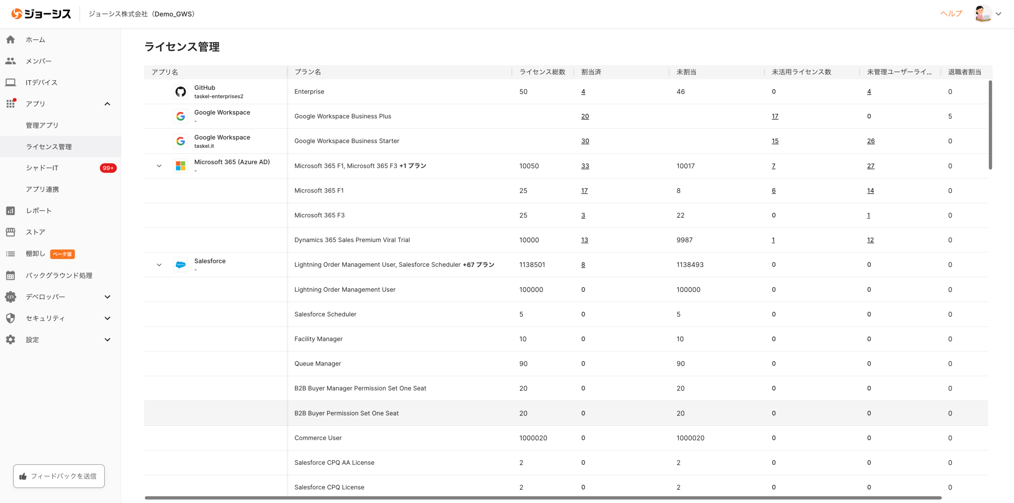 💡 ライセンス管理では、以下対応してるアプリの各プラン別ライセンス総数やステータス等を一元管理・確認することができます。本機能により未活用・非活用のライセンスの可視化が実現でき、ライセンス数の適正化を行うことが可能となります。