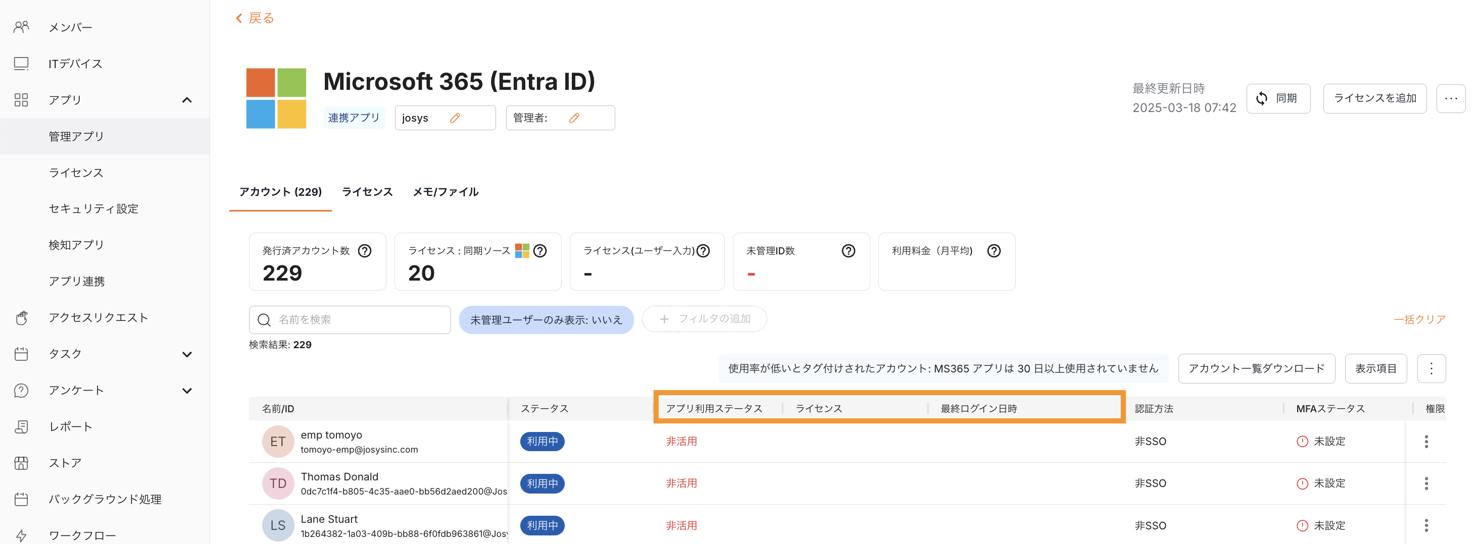 No. アプリ名 非活用判定 非活用条件 1 Google Workspace 対応 Gmailの最終利用日時(ログインまたは送信) 2 Microsoft 365 (Azure AD) 対応 MS365アプリの利用状況 3 Salesforce 対応 最終ログイン日時 4 GitHub(Enteprise Planのみ) 対応 監査ログ 5 Dropbox 対応 監査ログ 6 DUO 対応 最終ログイン日時 7 Box 対応 監査ログ 8 ZEPLIN 対応 最終ログイン日時 9 Smartsheet 対応 最終ログイン日時 10 Slack(プロ、ビジネスプラスのみ) 対応 最終利用日時 11 Onelogin 対応 最終ログイン日時 12 Miro Enterprise 対応 最終利用日時 13 LINE WORKS 対応 最終ログイン日時 14 Pipedrive 対応 最終ログイン日時 15 freshdesk 対応 最終利用日時 16 DocBase 対応 最終利用日時 17 TeamViewer 対応 最終ログイン日時 18 Aha! 対応 最終ログイン日時 19 NotePM 対応 最終ログイン日時 20 Zoom 対応 最後にミーティングをホストした日時 21 Backlog 対応 監査ログイン日時 22 Hubspot 対応 最終利用日時 23 Webex 対応 最終利用日時 25 Zendesk 対応 最終利用日時 26 Docusign 対応 エンベロープの最終署名または送信日時 27 Bugsnag 対応 最終利用日時 28 Redash 対応 最終利用日時 29 Sumo Logic 対応 最終ログイン日時 30 PagerDuty 対応 最終利用日時 31 Tableau 対応 最終利用日時 32 Udemy 対応 最終利用日時 33 Postman 対応 最終利用日時 34 Sentry 対応 最終利用日時 35 Microsoft Teams 対応 最終アクティビティ日付 36 ServiceTitan 対応 最終サインイン日時 37 ZOHO CRM 未対応 - 38 Sendgrid 未対応 - 39 Lucidchart 未対応 - 40 Dynatrace 対応 最終ログイン日時 41 Fivetran 対応 最終ログイン日時 42 Klipfolio 対応 最終ログイン日時 43 LaunchDarkly 対応 最終ログイン日時 44 Mail Dealer 対応 最終ログイン日時 45 Make 対応 最終ログイン日時 46 NI Collabo 対応 最終ログイン日時 47 Pipefy 対応 最終ログイン日時 48 Pipeliner CRM 対応 最終ログイン日時 49 Planview AgilePlace 対応 最終ログイン日時 50 Podio 対応 最終ログイン日時 51 Snowflake 対応 最終ログイン日時 52 Splunk 対応 最終ログイン日時 53 Teamgate 対応 最終ログイン日時 54 Thinkst Canary 対応 最終ログイン日時 55 Timecamp 対応 最終ログイン日時 💡非活用条件から30日経過すると、アプリ利用ステータスに「非活用」が表示されます