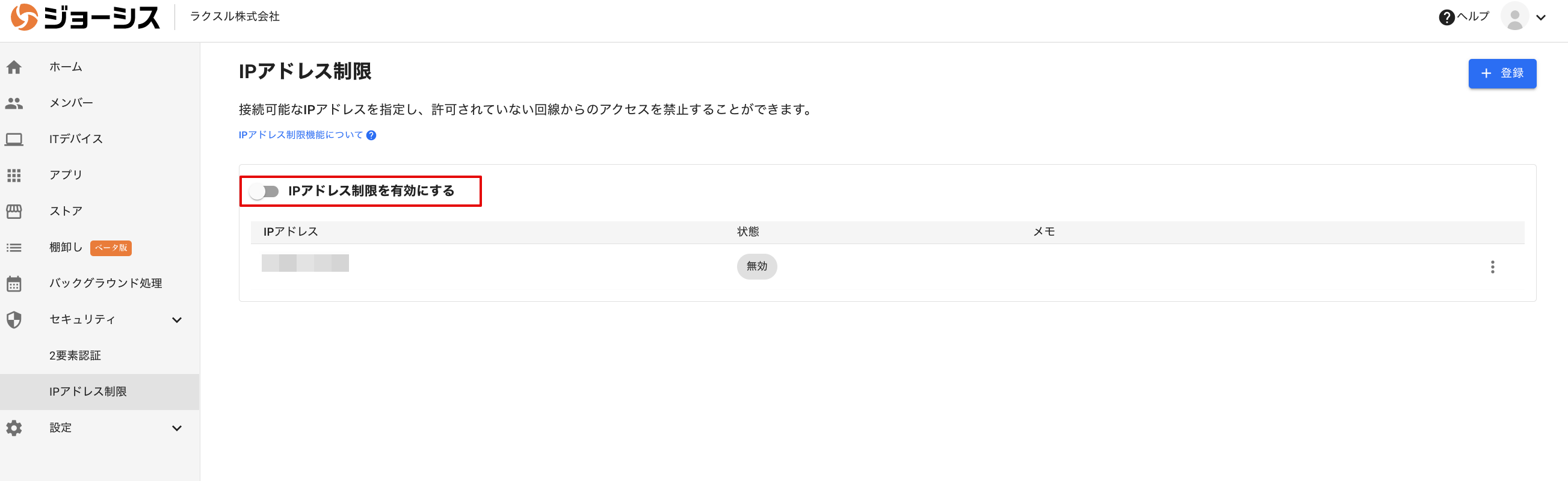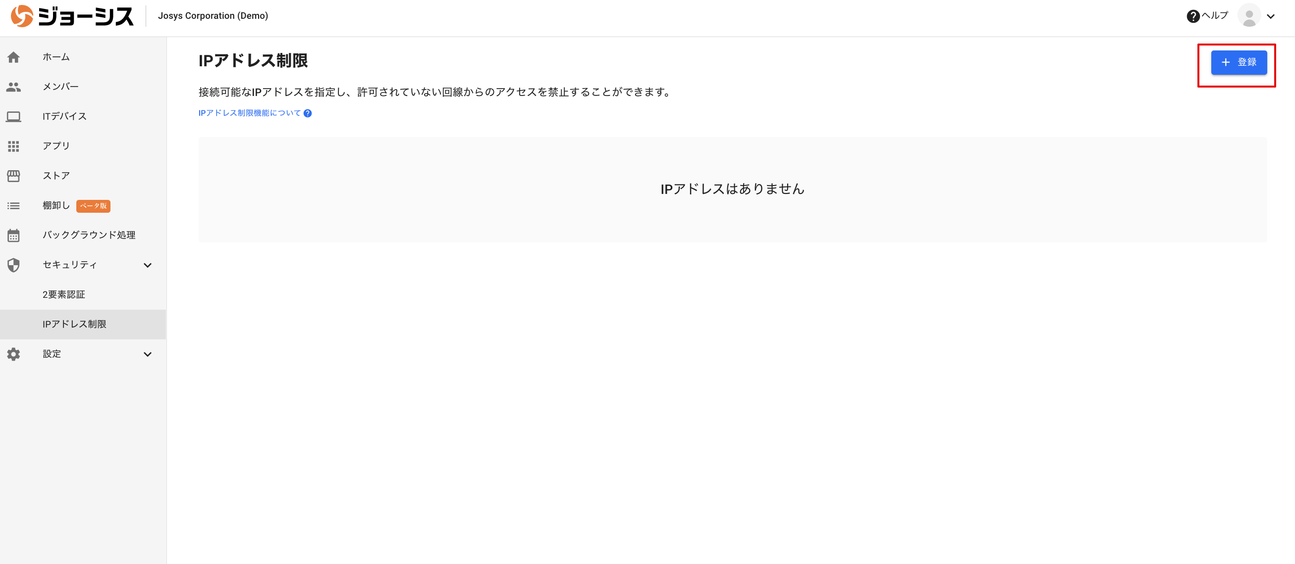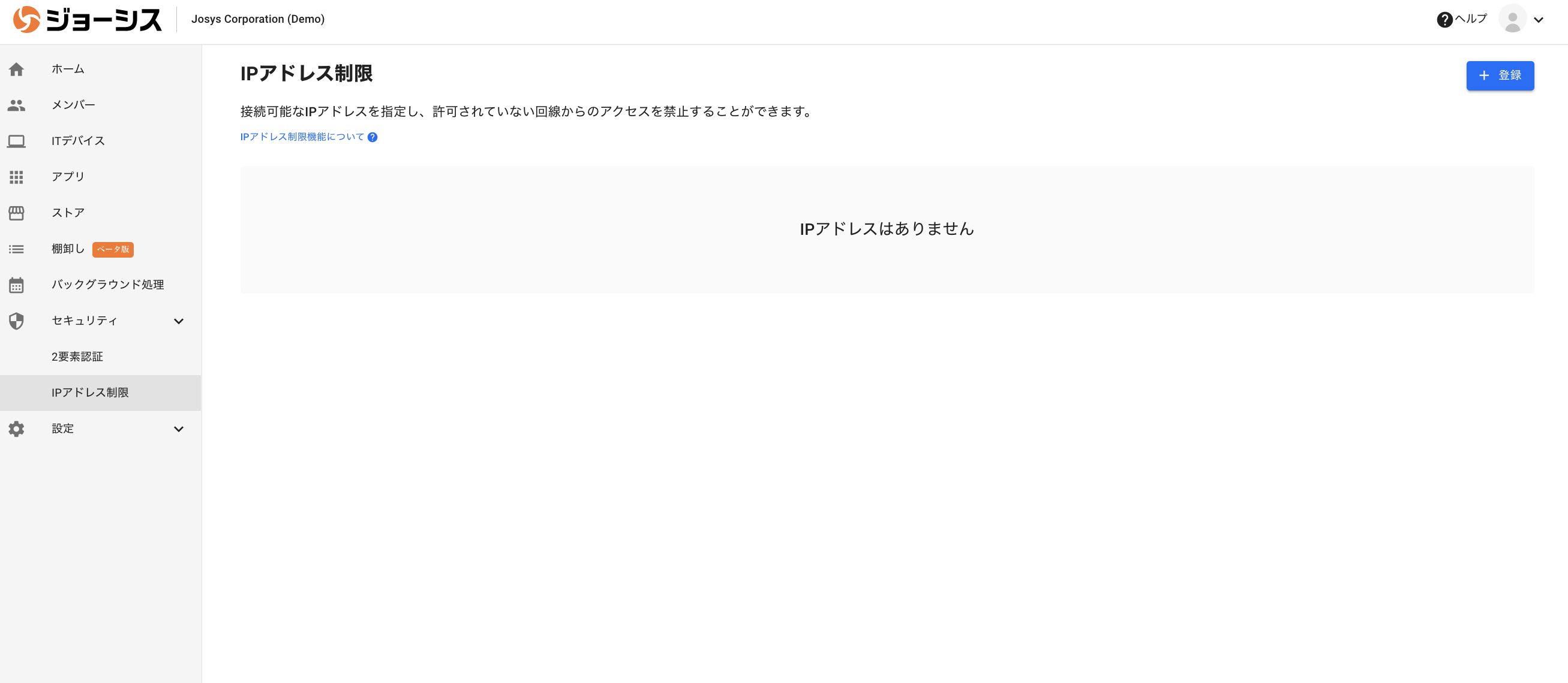 ⚠️ IPアドレス、IPアドレスレンジに誤った設定を行い、Josysの管理コンソールにアクセスできなくなった場合は、サポートまでお問い合わせください。