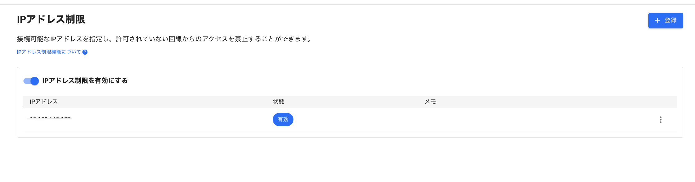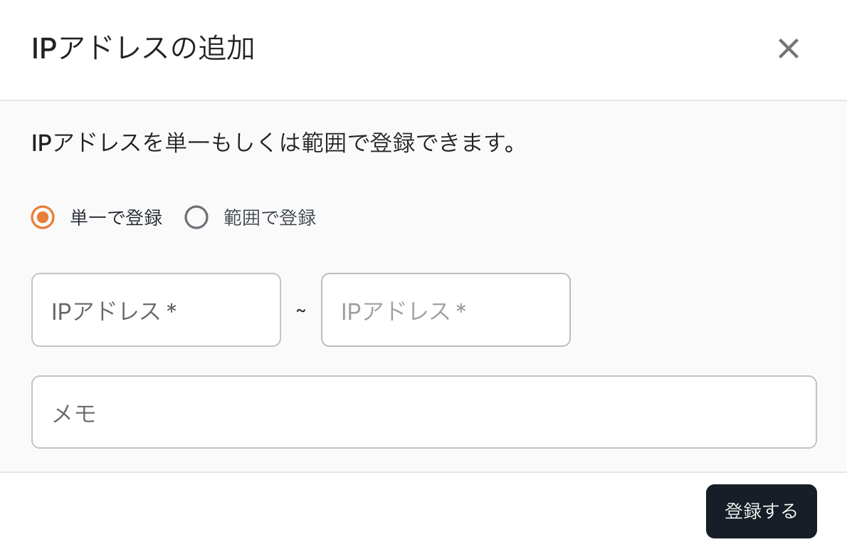 登録をクリックします。登録は特定のIPアドレスを指定する場合は、「単一で登録」、特定のIPアドレスレンジを設定する場合は「範囲で登録」を選択し入力してください。