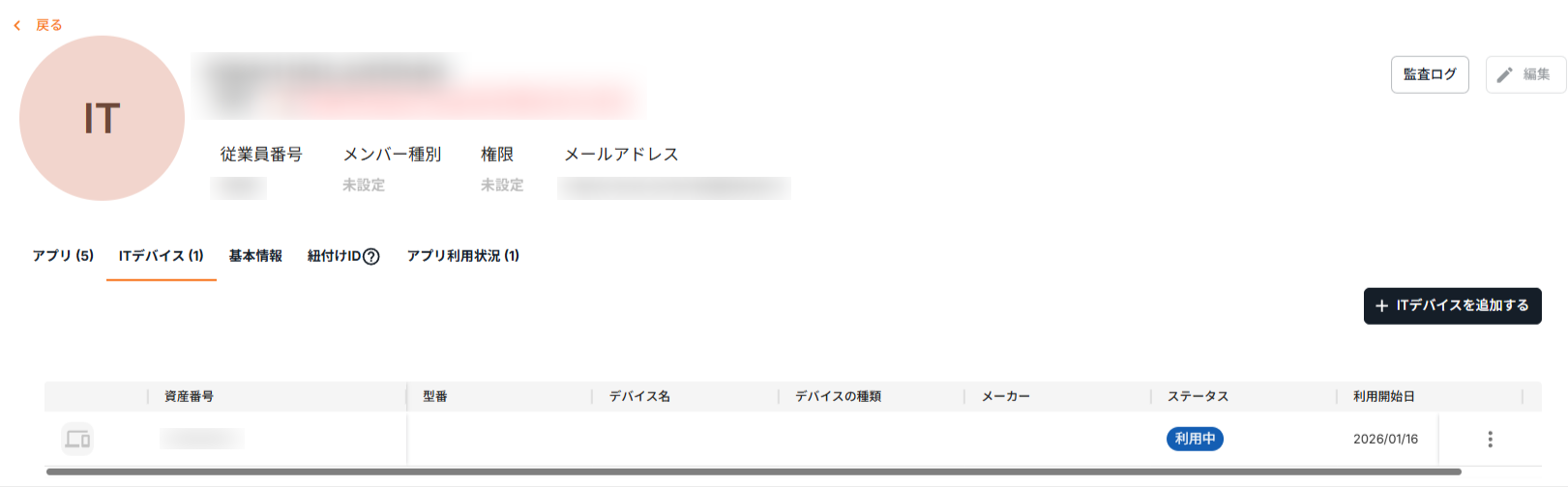 3.該当メンバーの詳細画面内の横の列の中から「ITデバイス」をクリックしてください。