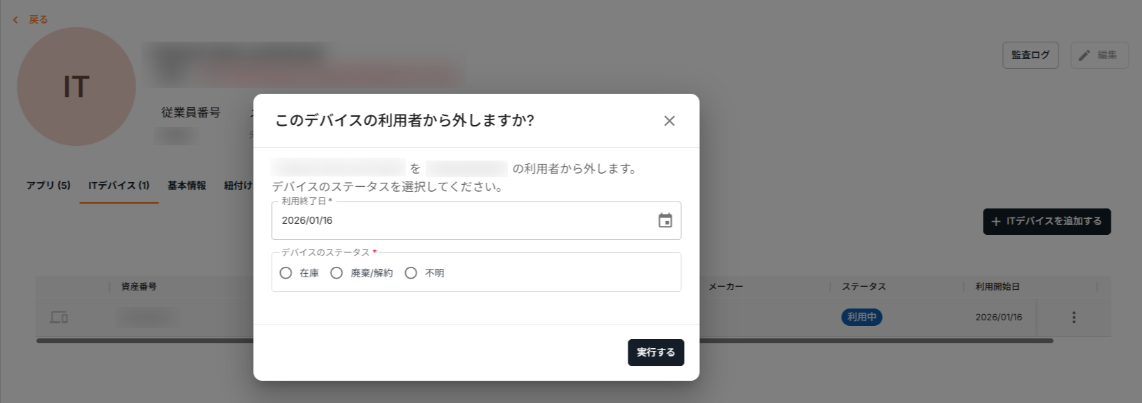 5.利用終了日と、利用終了後のデバイスのステータス(在庫、廃棄/解約、不明)を選択します。