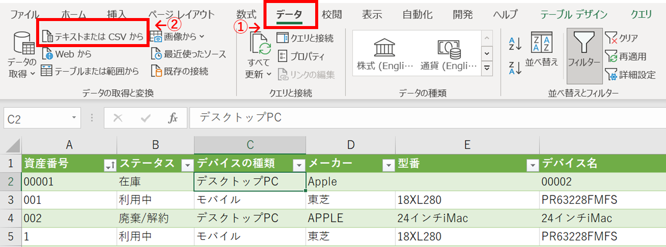 - 添付の通りデータタブよりテキストまたはCSVからを選択してください。