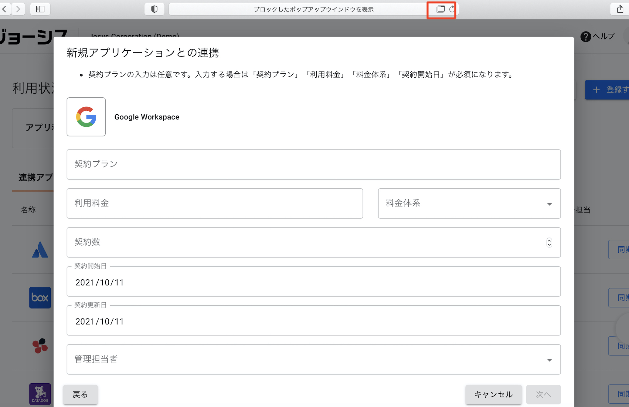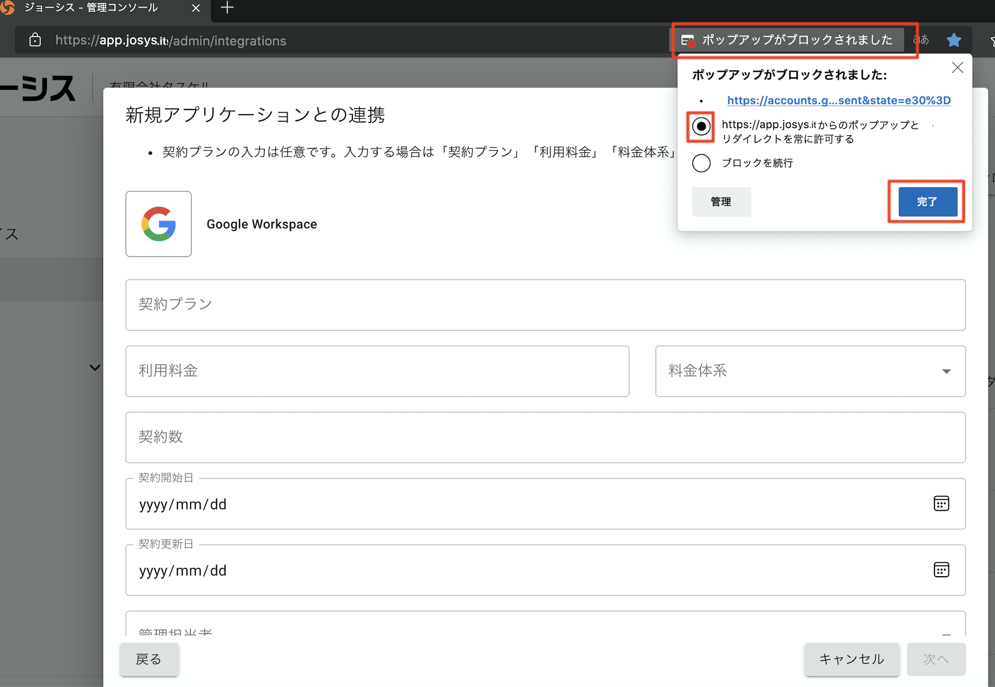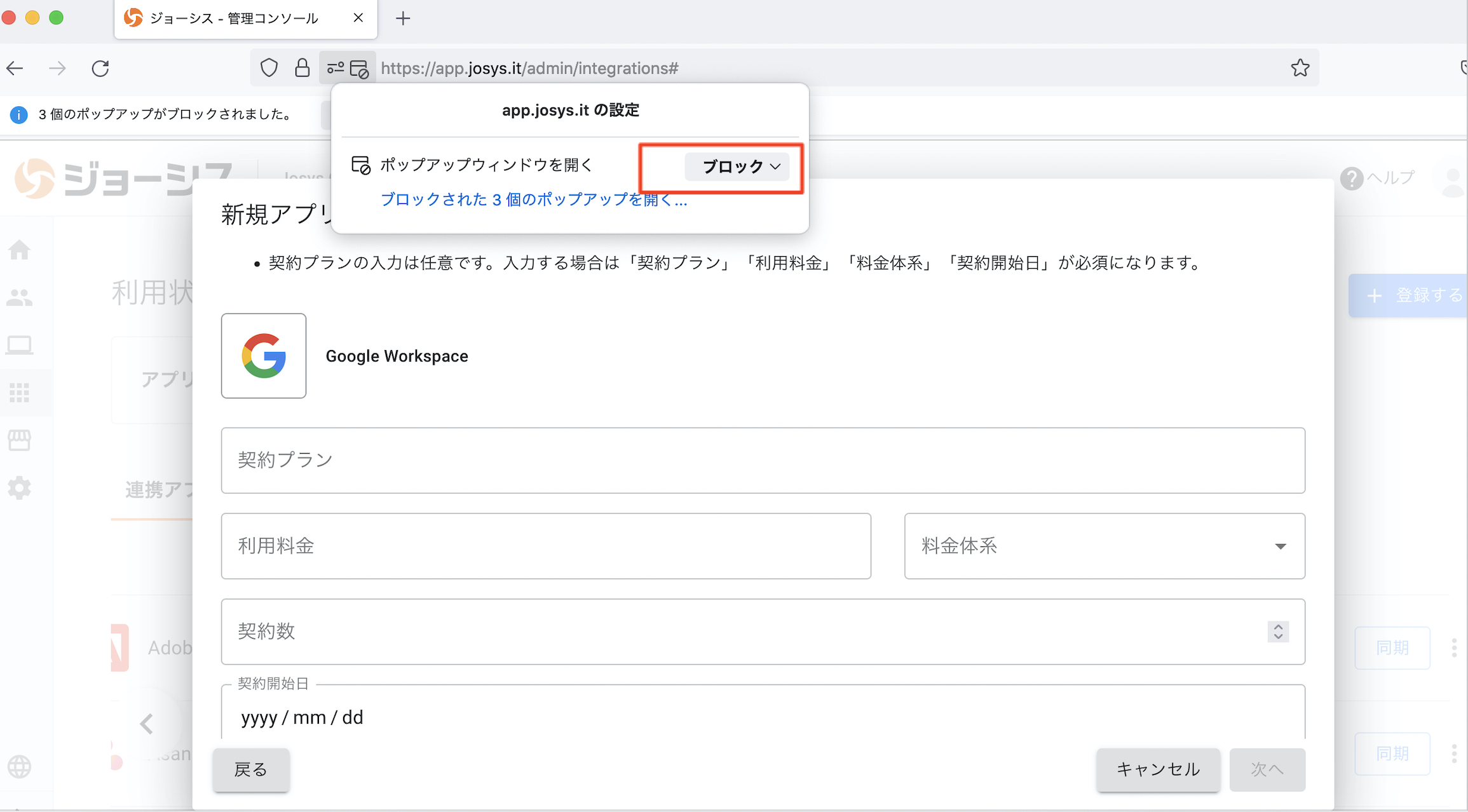 アプリ連携などのポップアップがブロックされる場合は、解除してください。