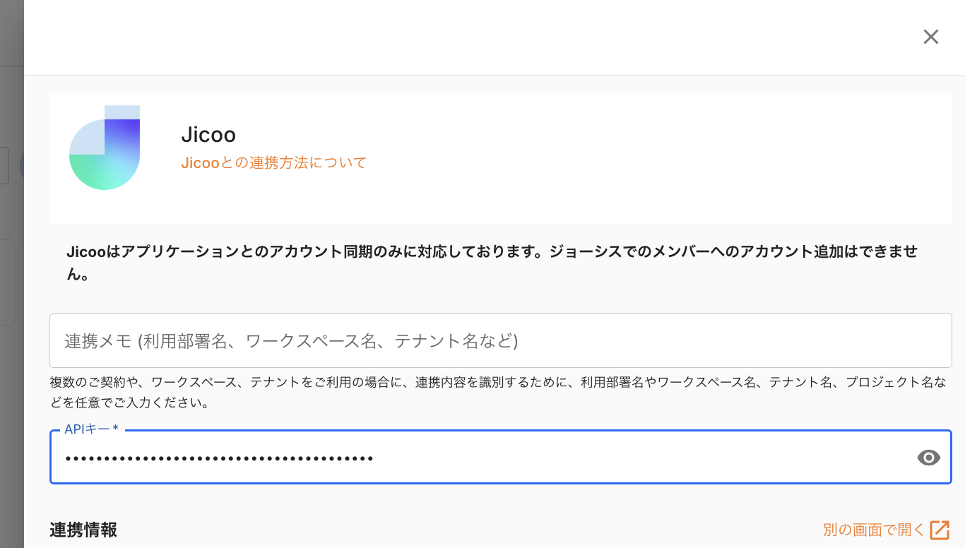 ジョーシスのアプリ連携ページでJicooを連携する手順です