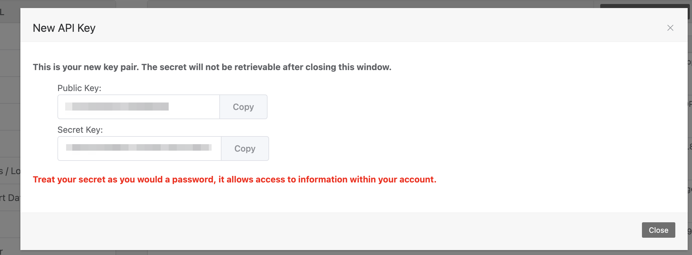 CreateAPI Keyをクリックしメニューから、Public Key、Secret Keyをコピーします