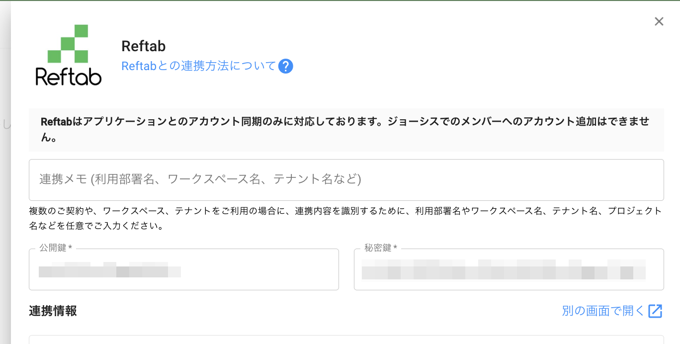 ジョーシスのアプリ連携ページでReftabを連携する手順です