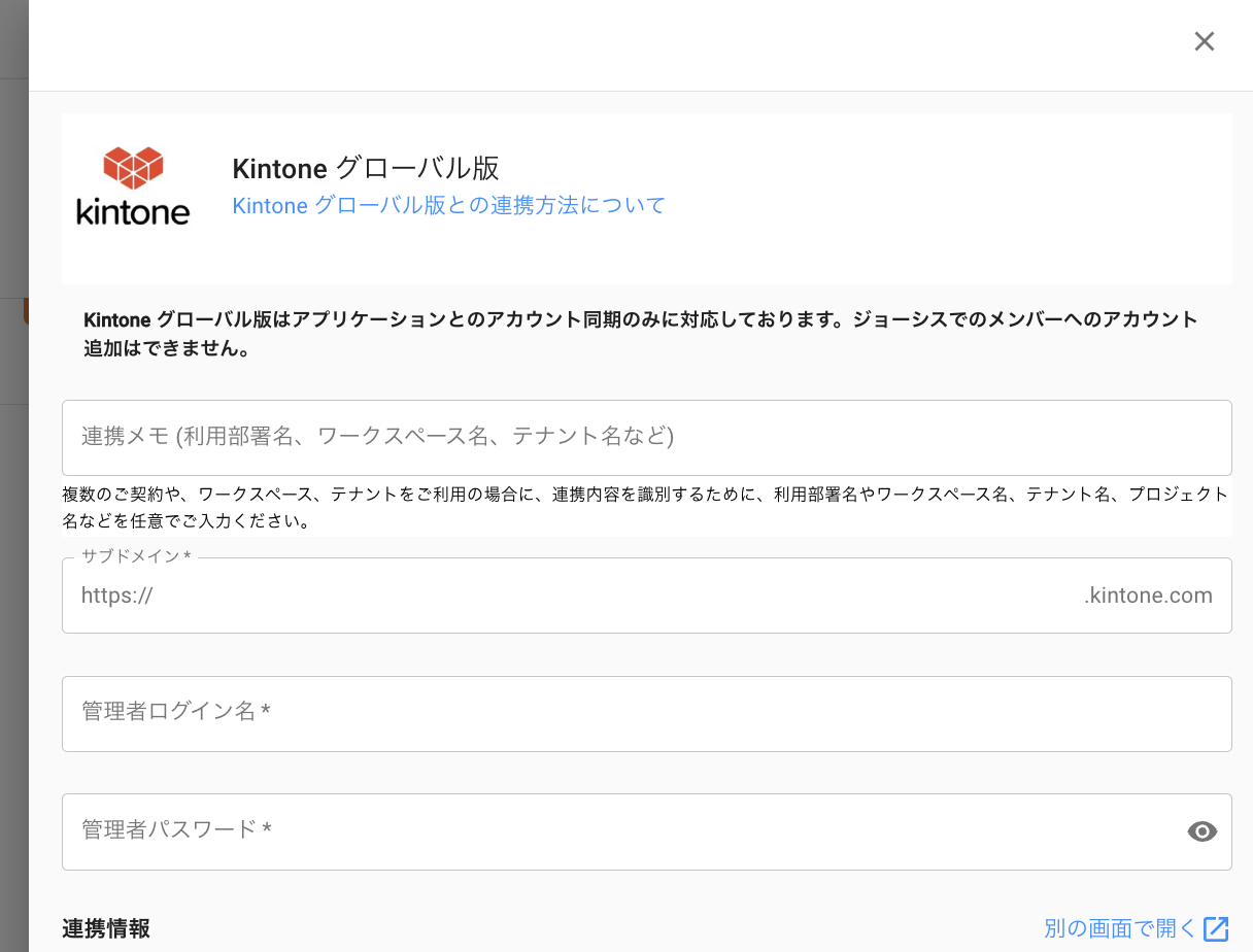 ジョーシスのアプリ連携ページでKintone グローバル版を連携する手順です