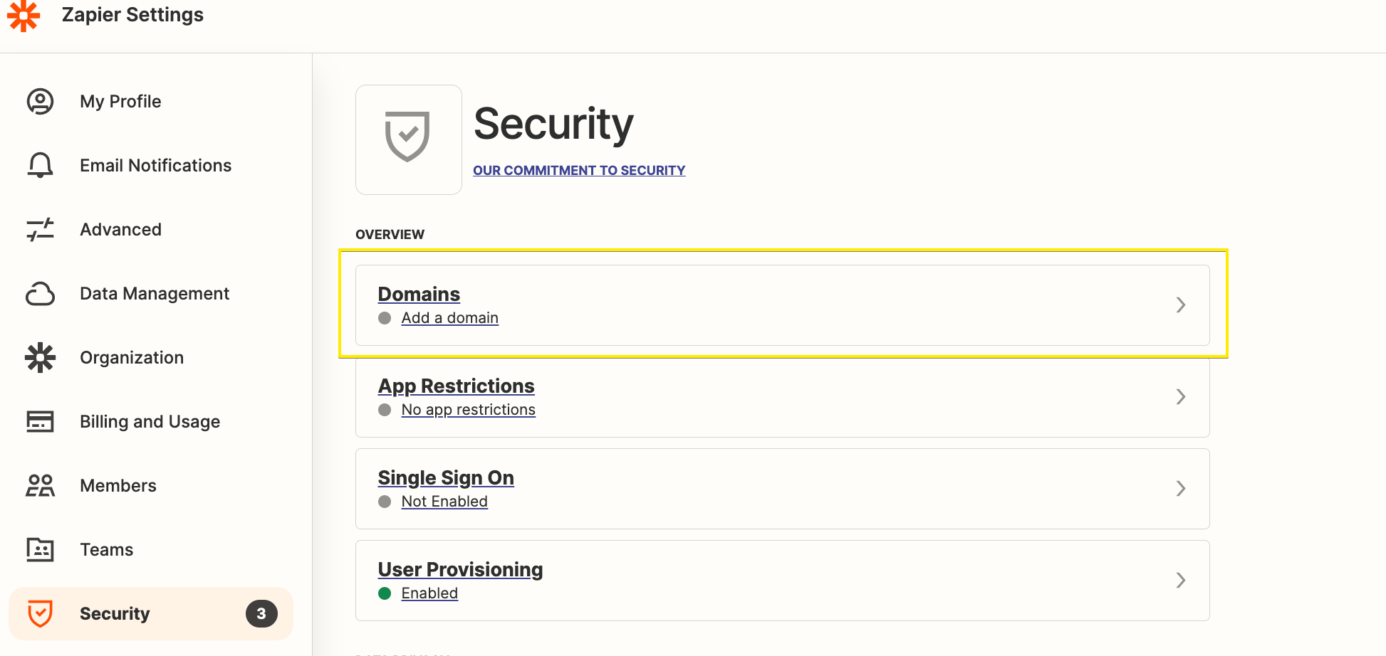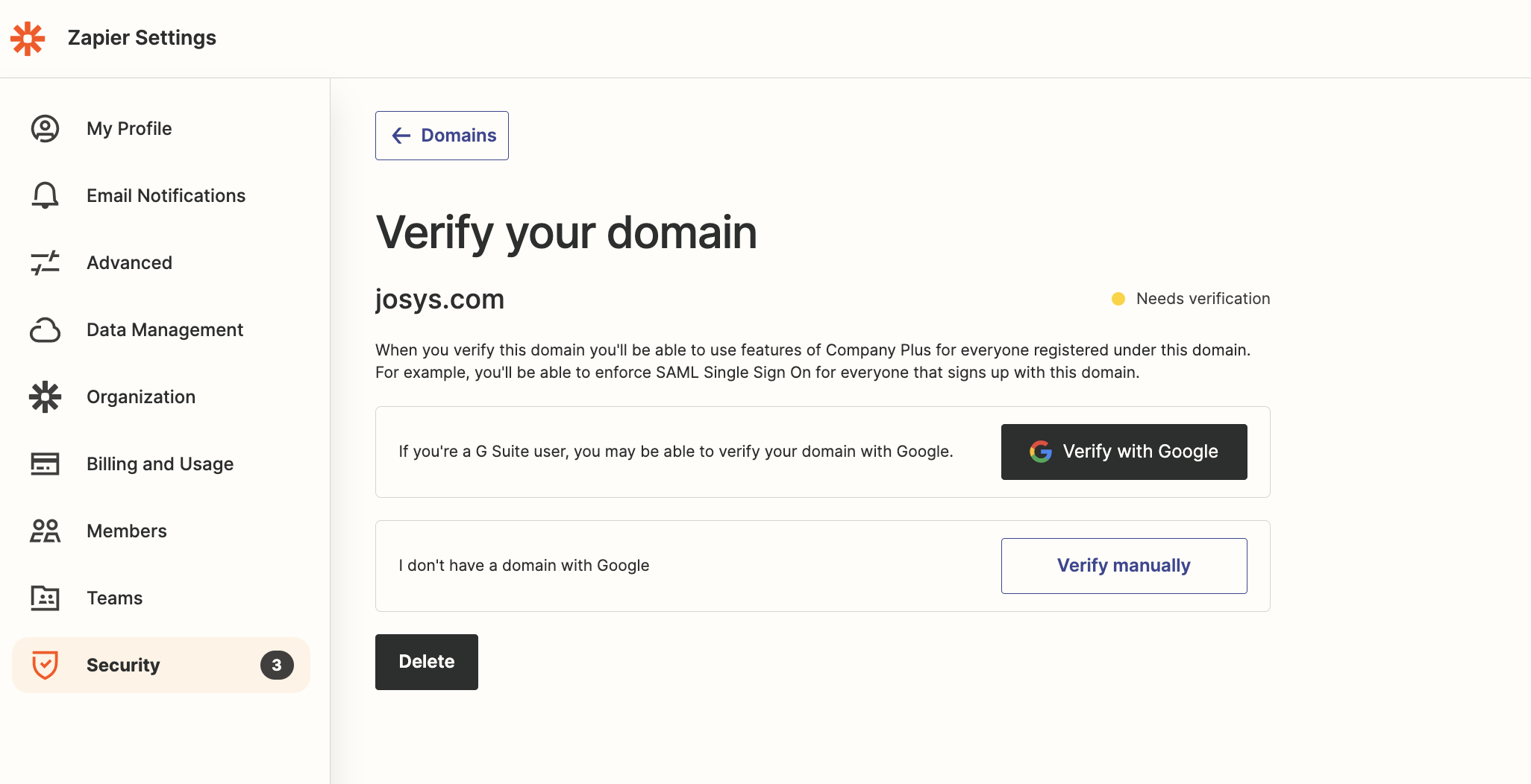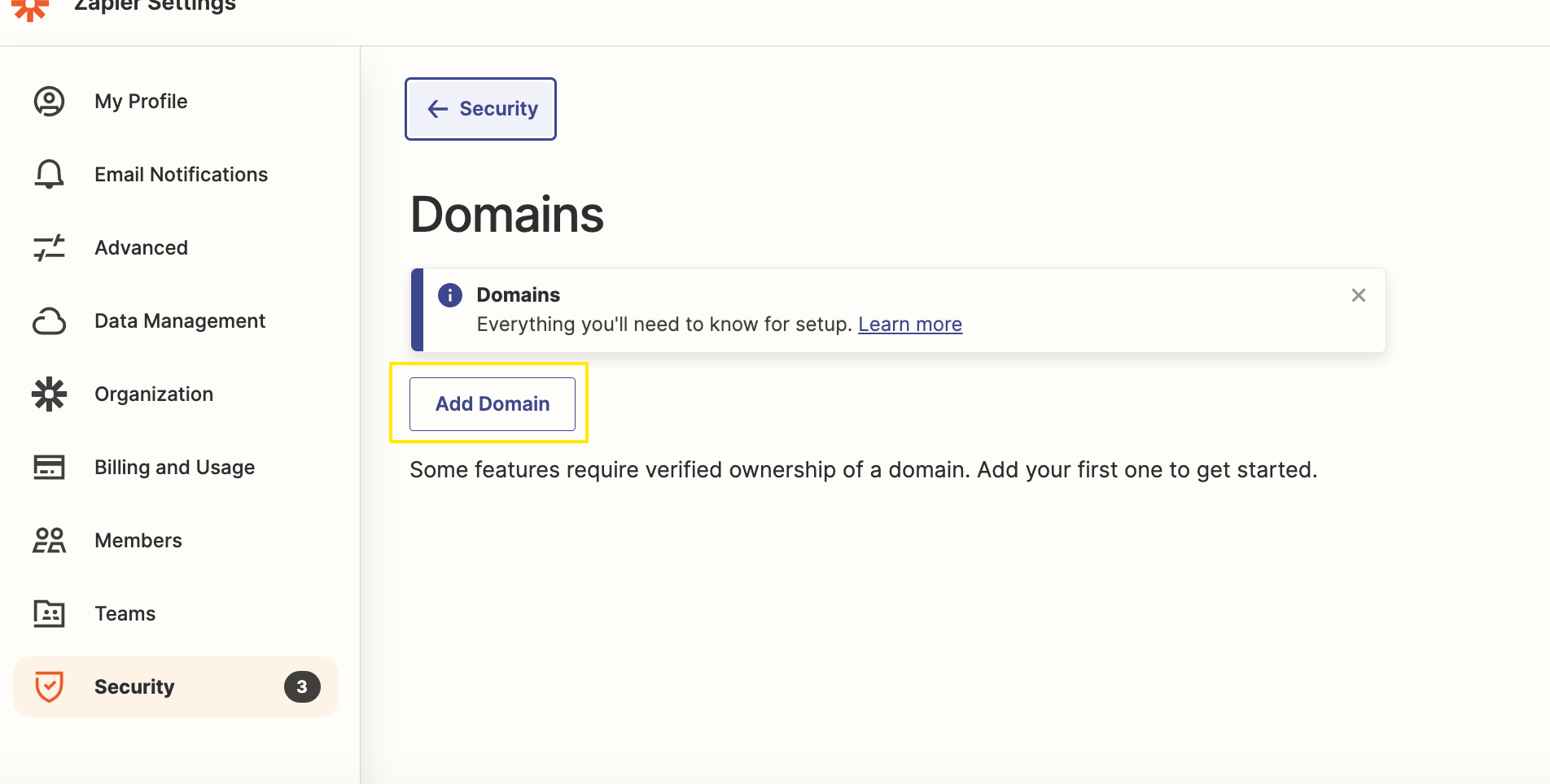 ZapierにOwnerまたはAdminカウントでログインし、Setting>Security 内のDomainsをクリックします。 Add Domainをクリックしドメイン名を登録します いずれかの方法でドメインの認証を完了し、ドメイン登録を完了します。