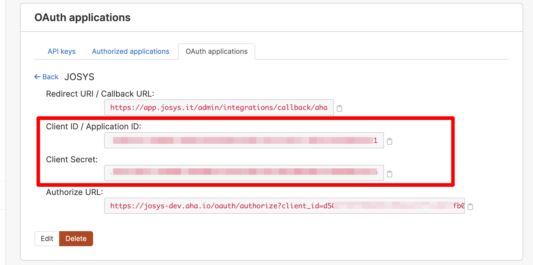 Redirect URLにはhttps://app.josys.it/admin/integrations/callback/aha