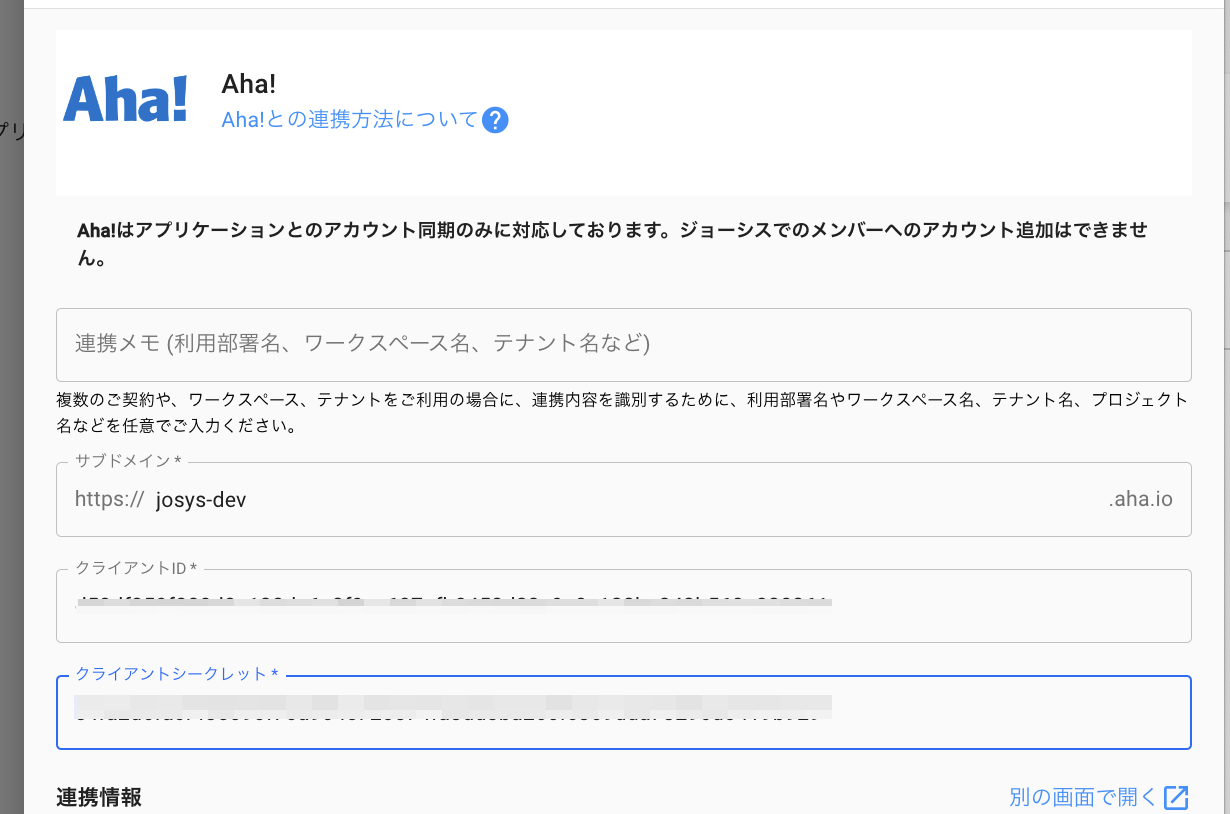 ジョーシスのアプリ連携ページでAha!を連携する手順です