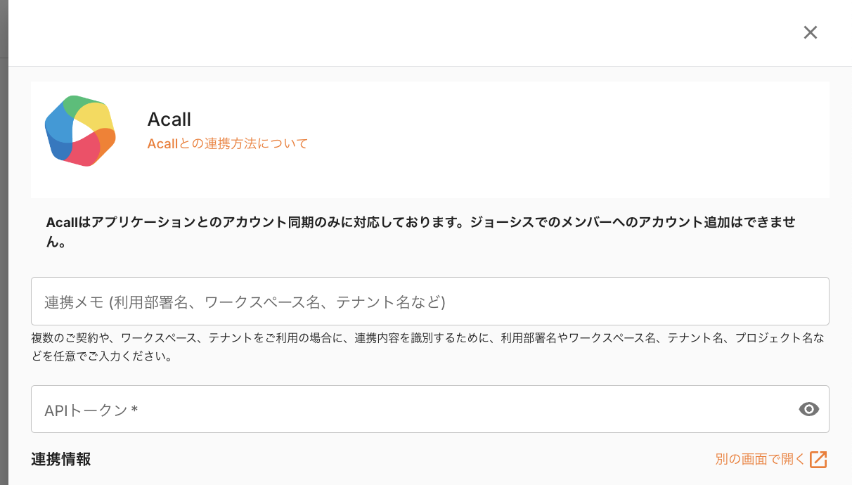 ジョーシスのアプリ連携ページでAcallを連携する手順です