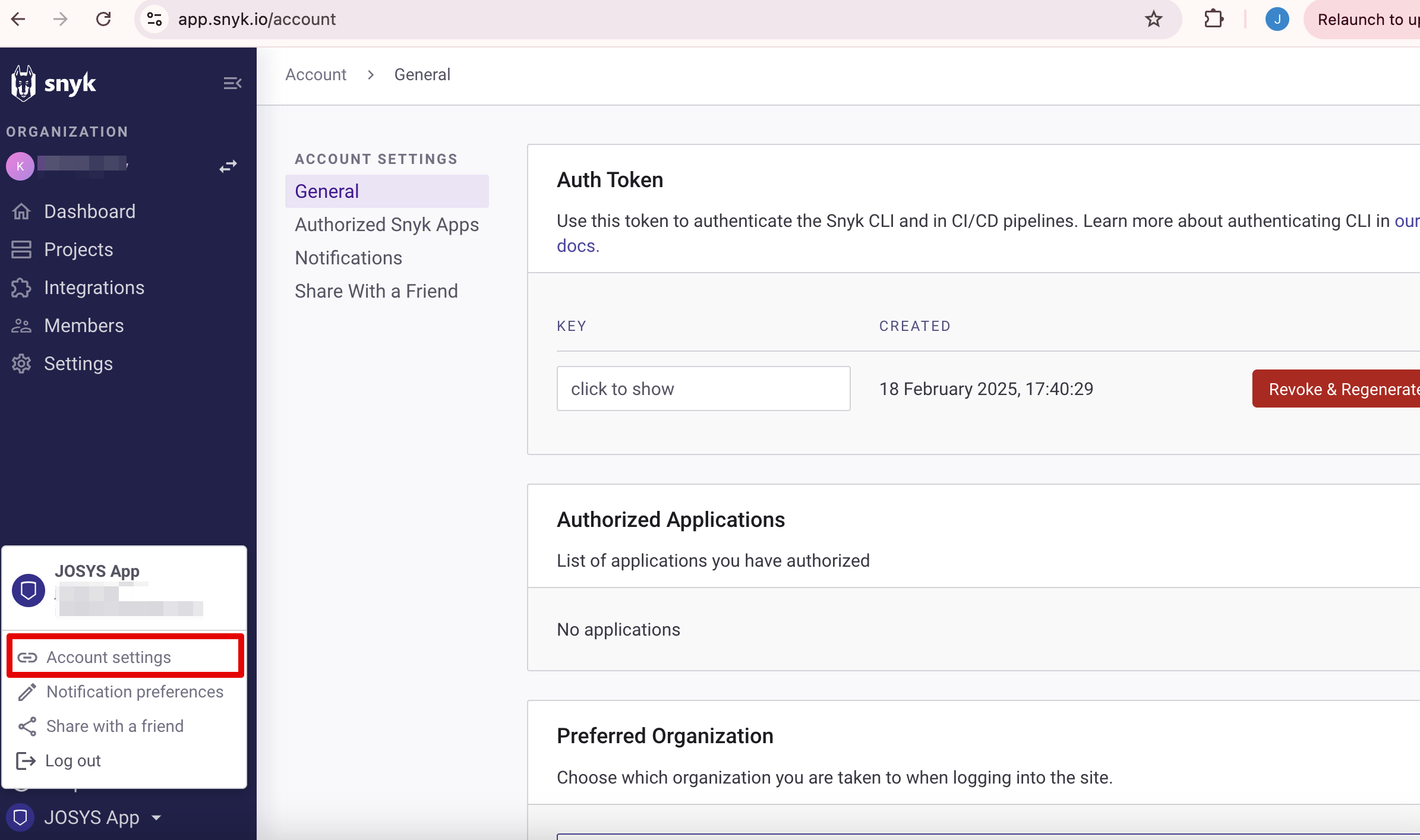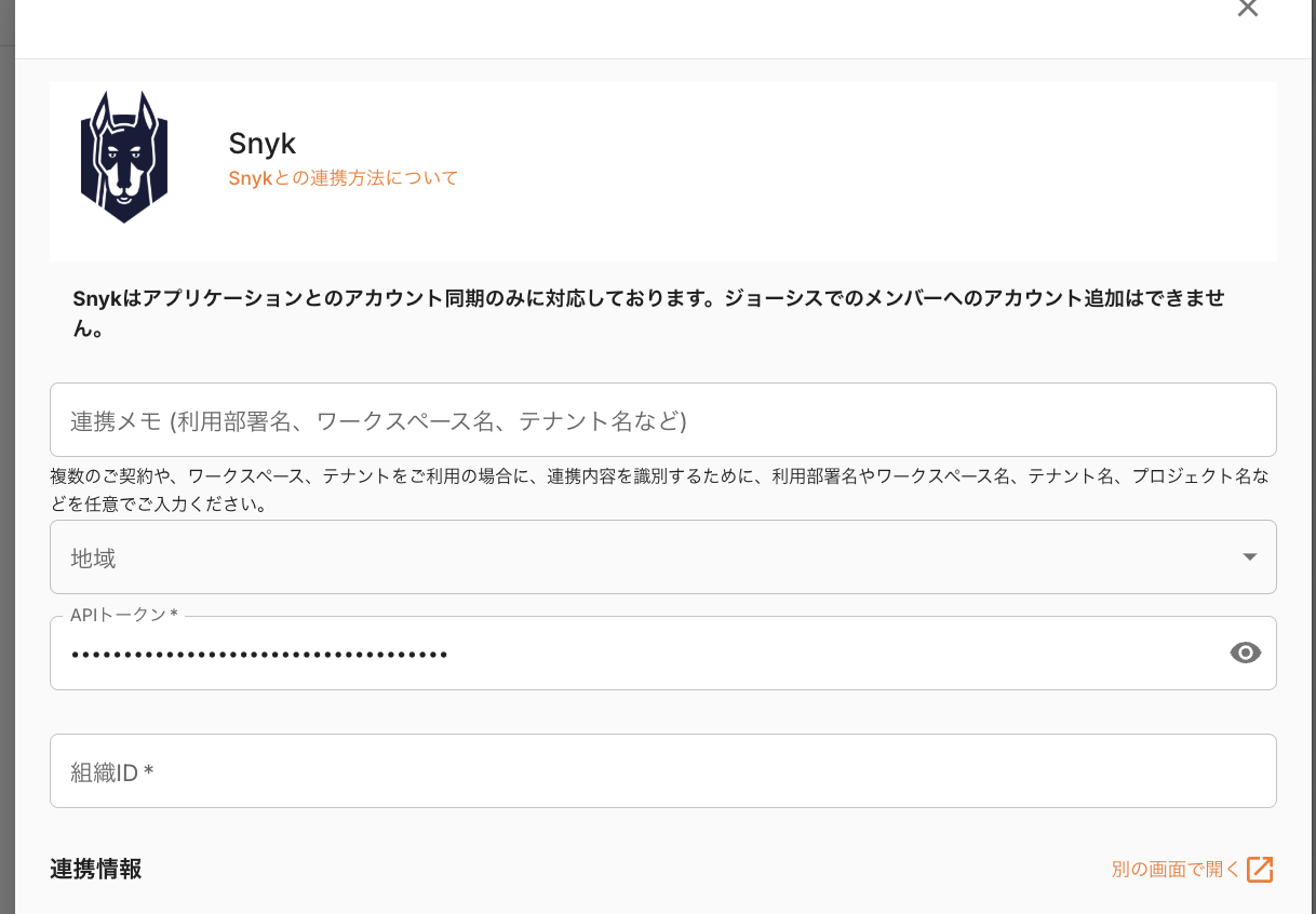 ジョーシスのアプリ連携ページでSnykを連携する手順です
