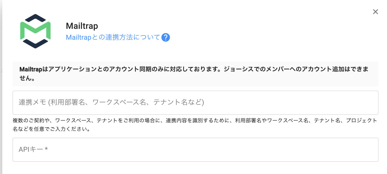 ジョーシスのアプリ連携ページでMailtrapを連携する手順です