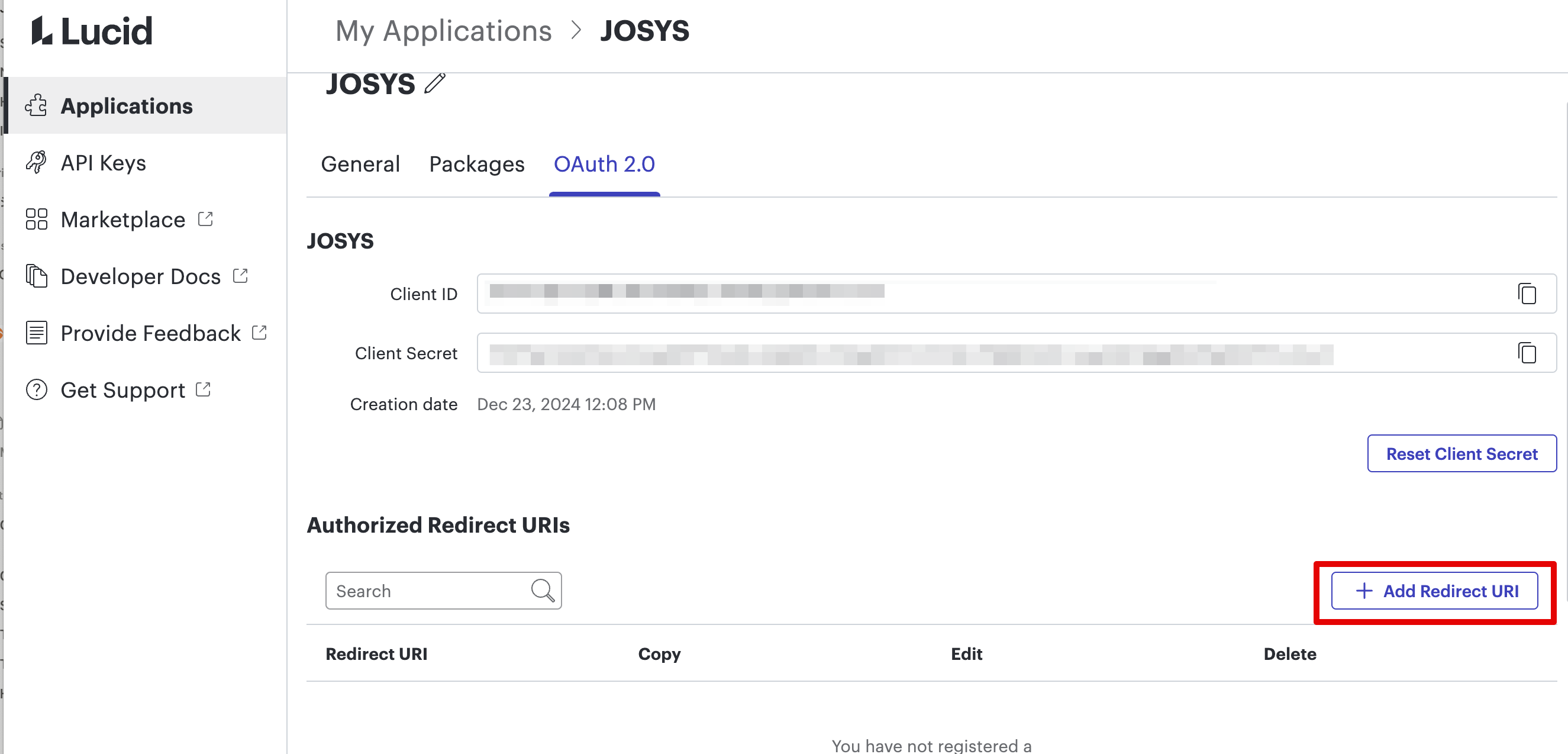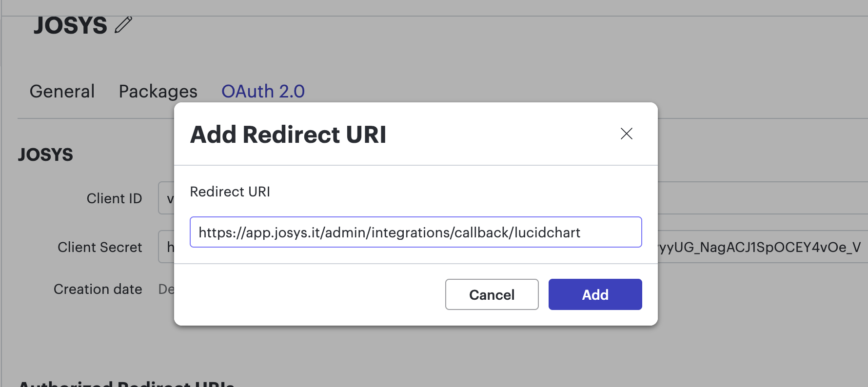 Add Redirect URIをクリックし 、https://app.josys.it/admin/integrations/callback/lucidchartと入力し、Addをクリックします。