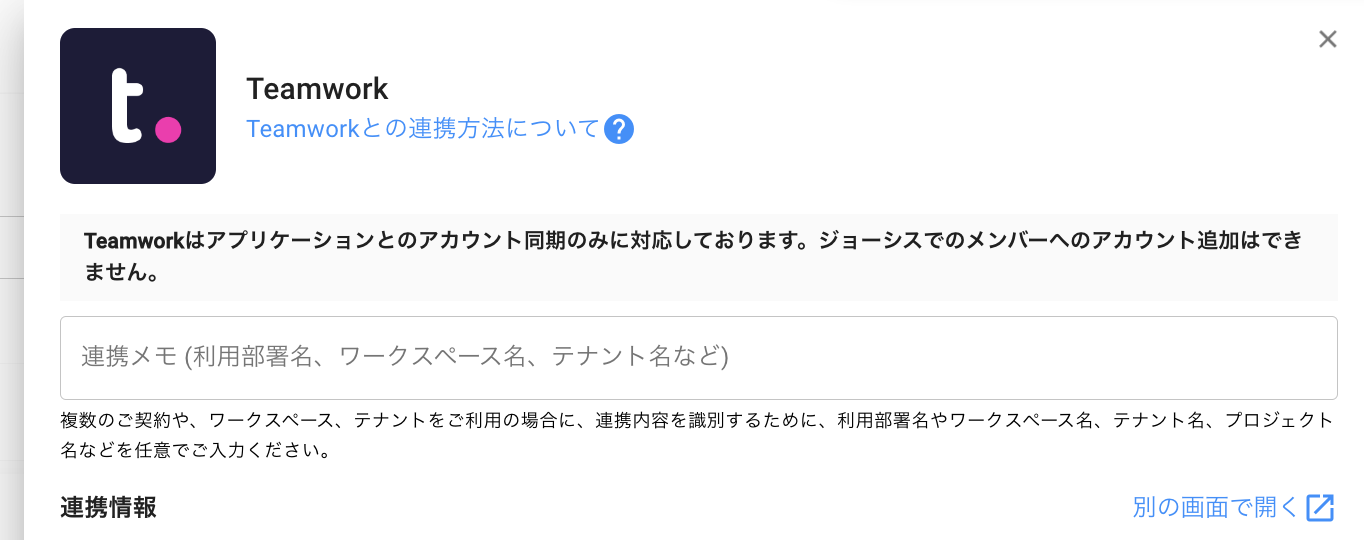 ジョーシスのアプリ連携ページでTeamworkを連携する手順です