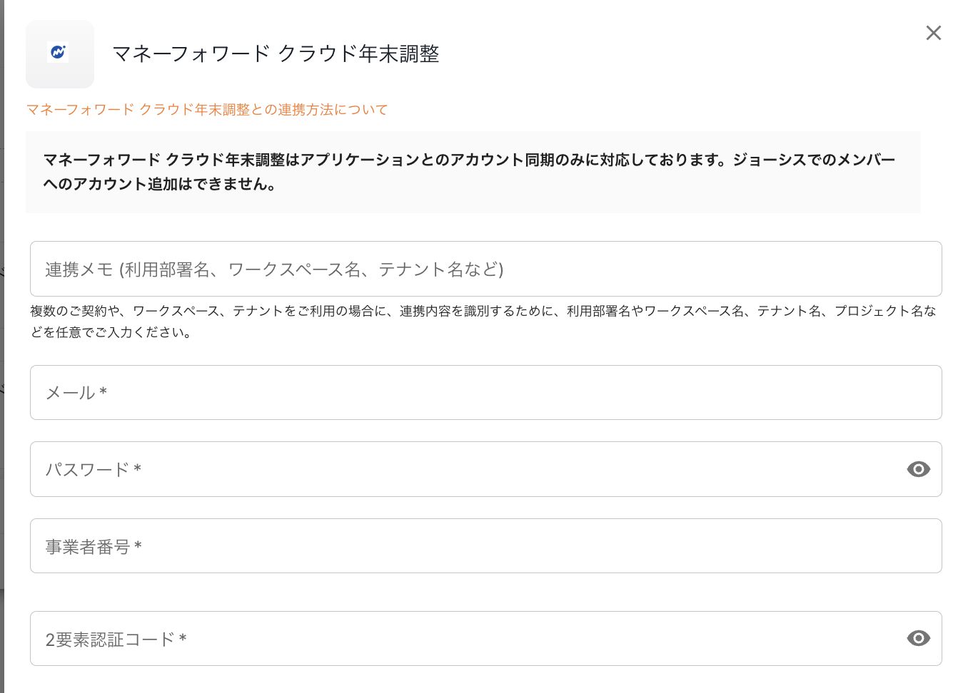 ジョーシスのアプリ連携ページでマネーフォワード クラウド年末調整を連携する手順です
