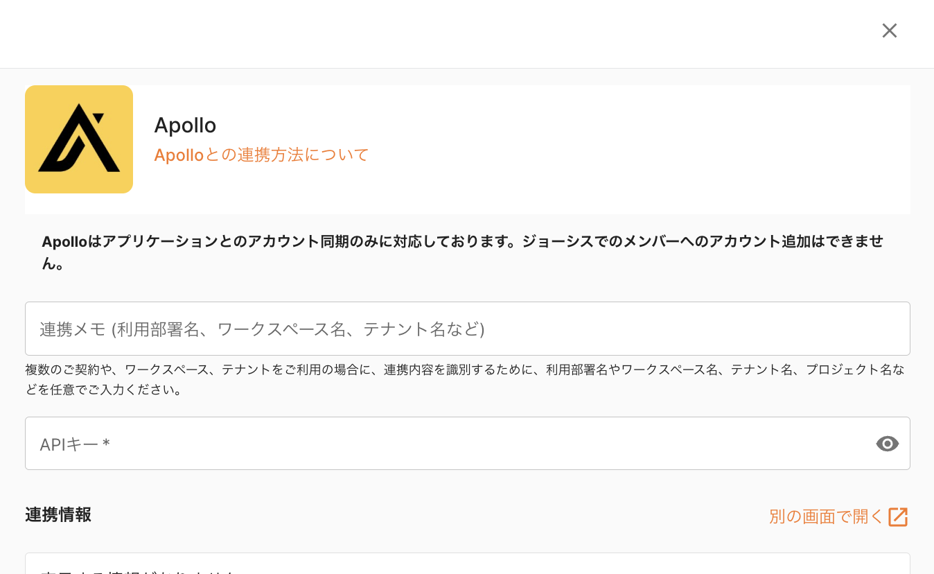 ジョーシスのアプリ連携ページでApolloを連携する手順です