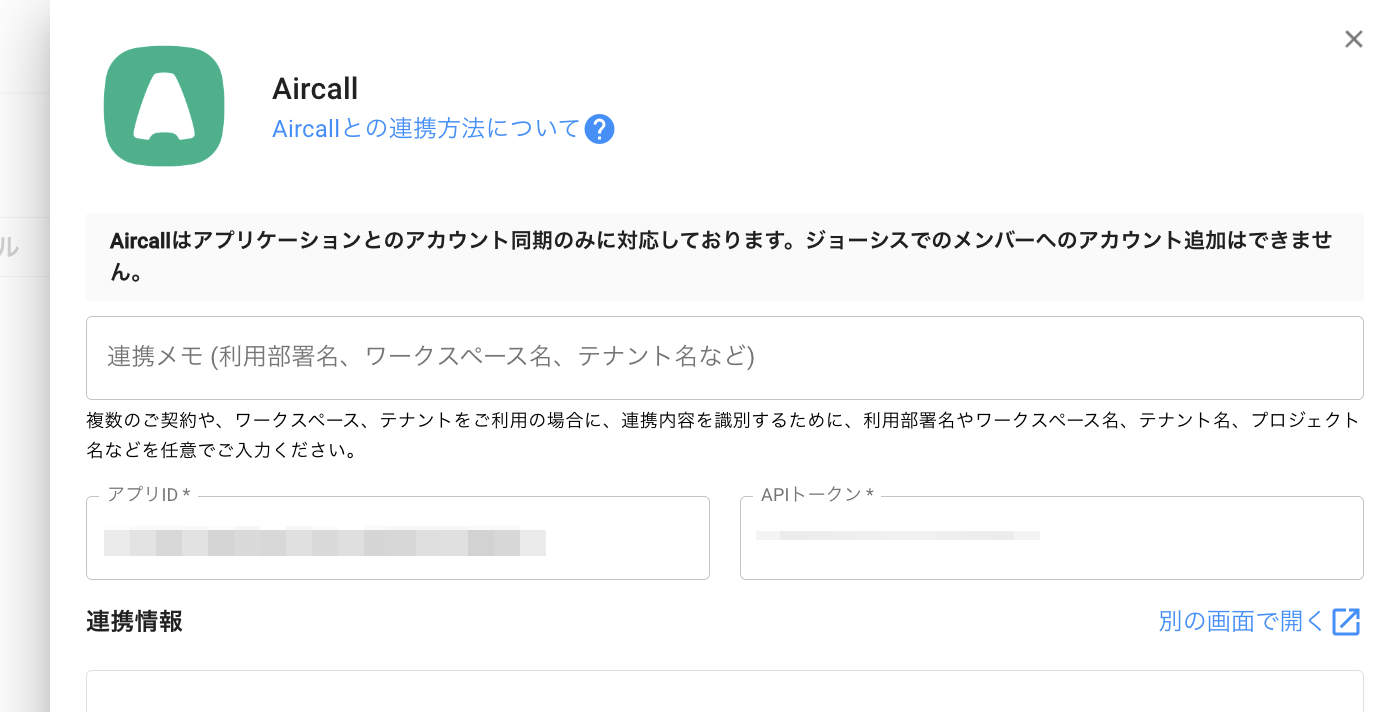 ジョーシスのアプリ連携ページでAircallを連携する手順です