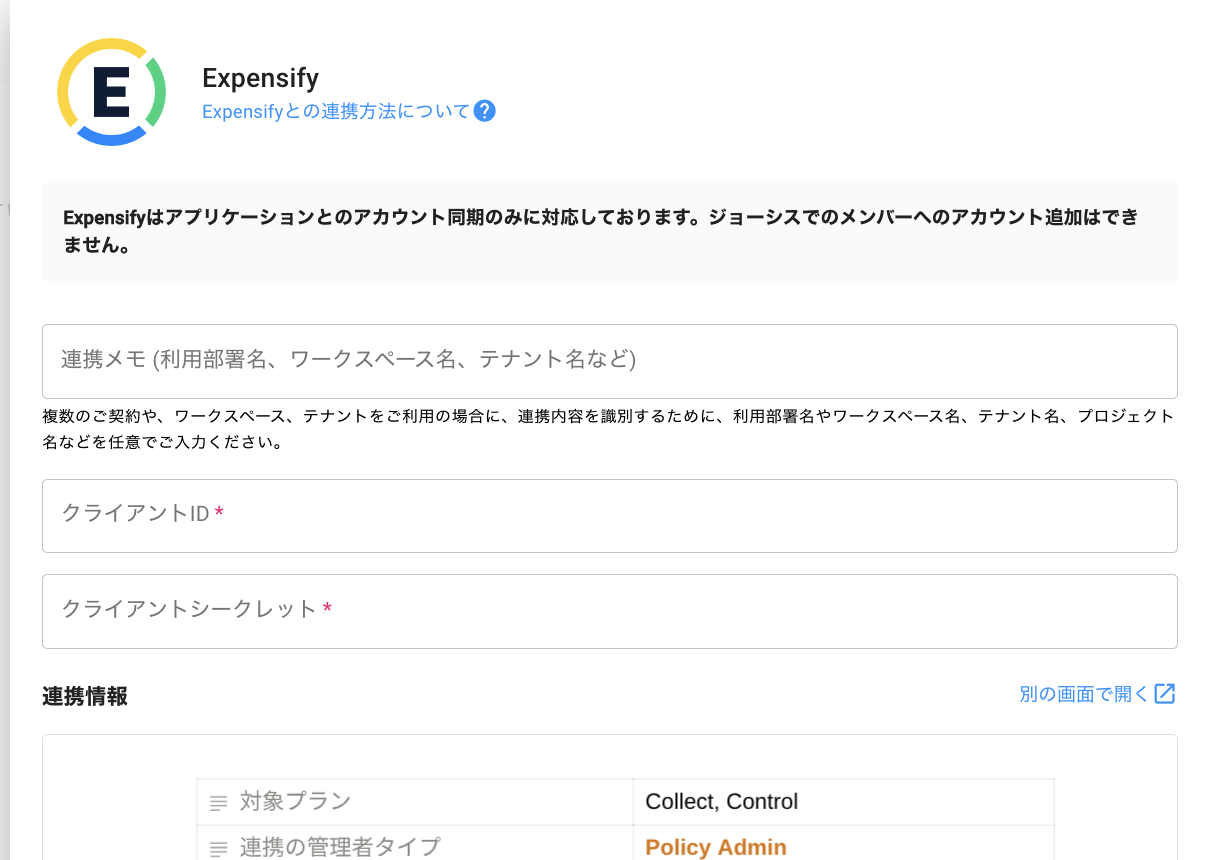 ジョーシスのアプリ連携ページでExpensifyを連携する手順です