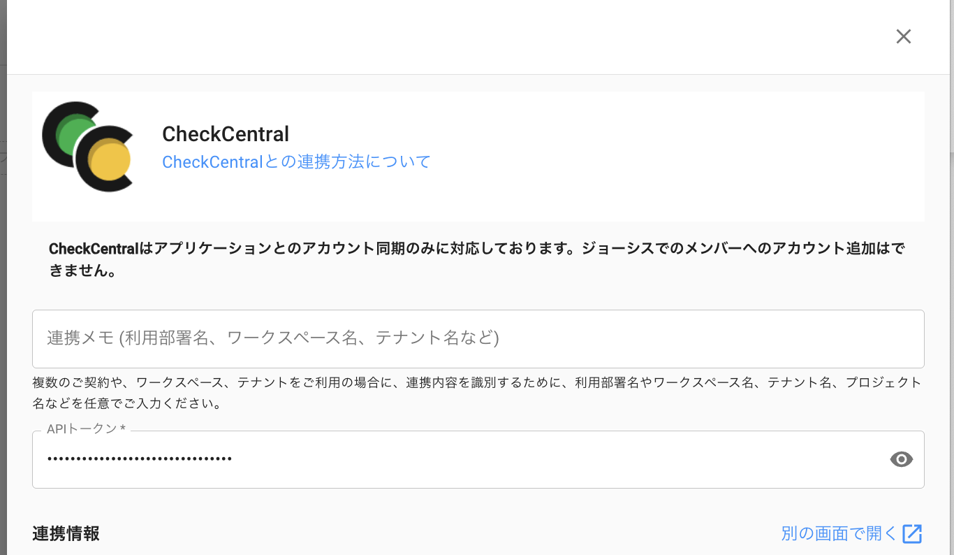 ジョーシスのアプリ連携ページでCheckCentralを連携する手順です