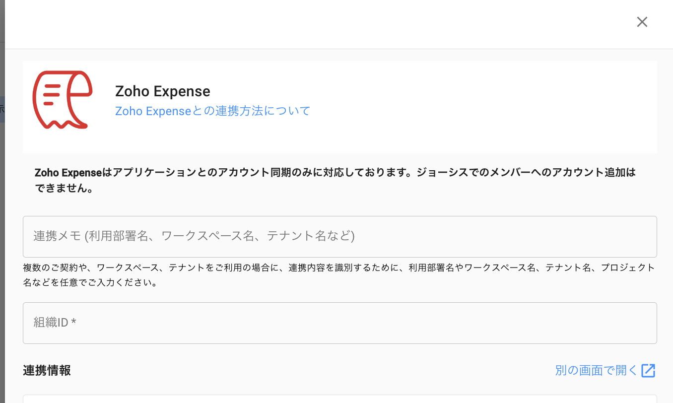 ジョーシスのアプリ連携ページでZoho Expenseを連携する手順です