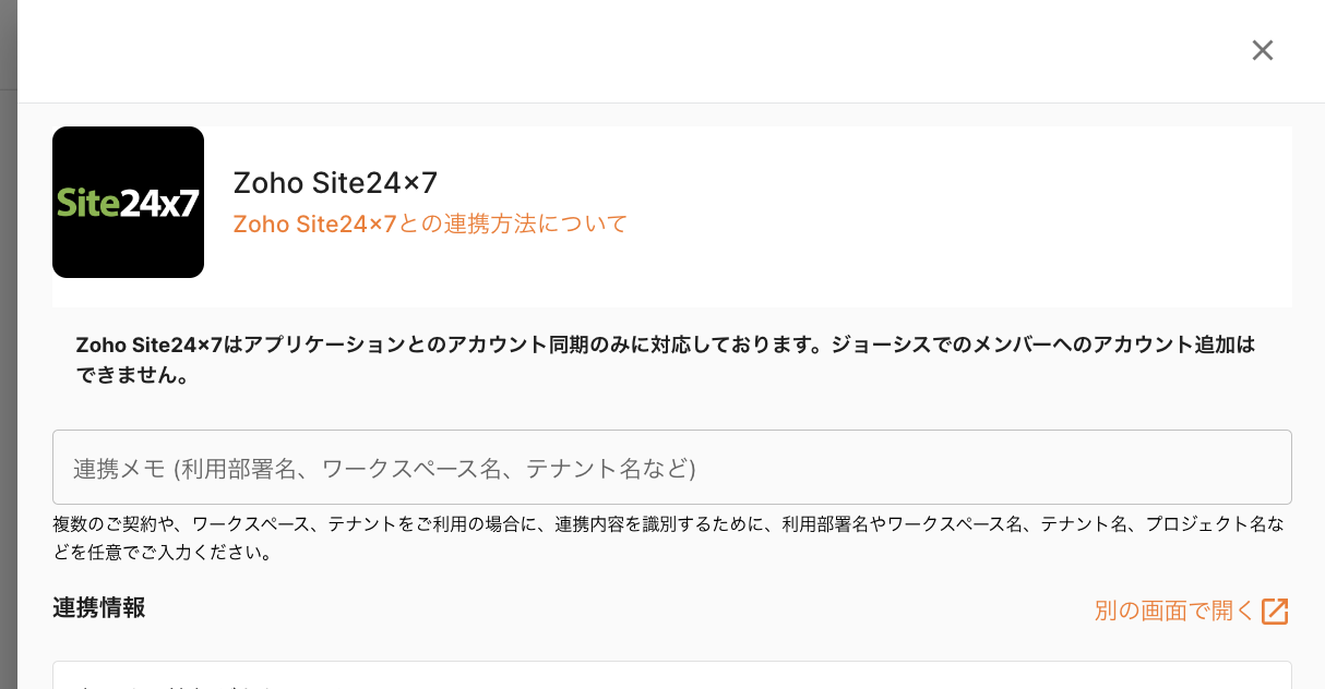 ジョーシスのアプリ連携ページでZoho Site24x7を連携する手順です