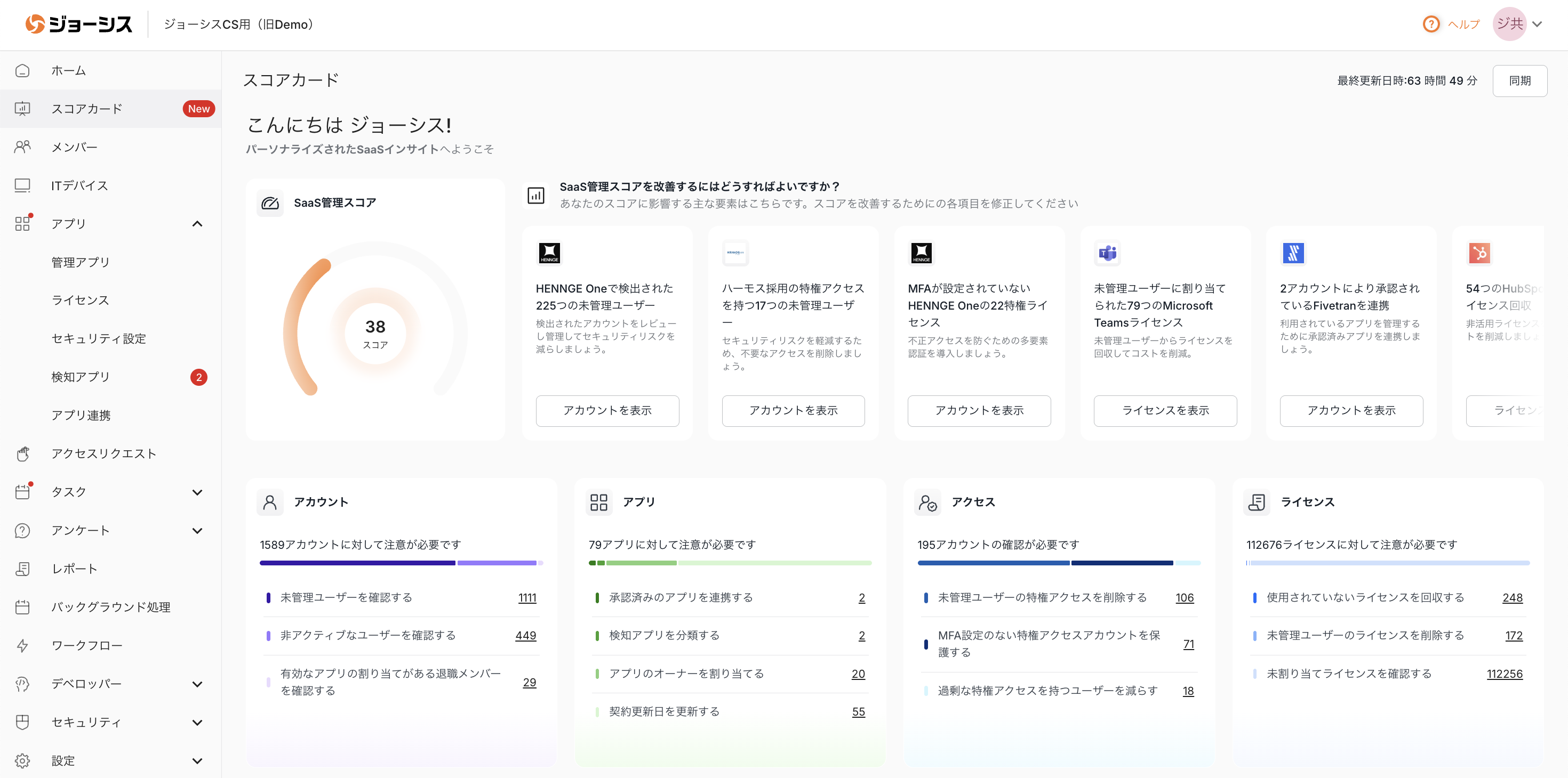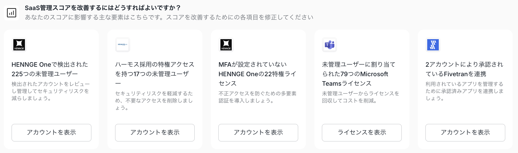 SaaS管理スコアを向上させるには、画面右上に表示されている内容に応じて対応を行なってください。「アカウントを表示」をクリックすることで該当アプリの詳細を確認いただくことが可能です。