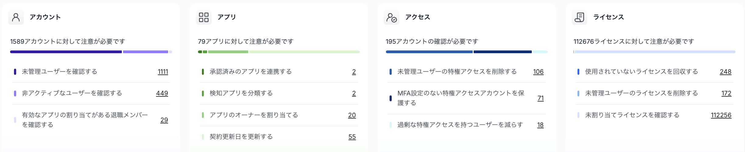 スコアカードは、アカウント、アプリ、アクセス、ライセンスという4つの主要コンポーネント内の様々な要素を分析しています 。各項目のカウント数をクリックすると詳細情報が表示され、必要なアクションを実行できます。