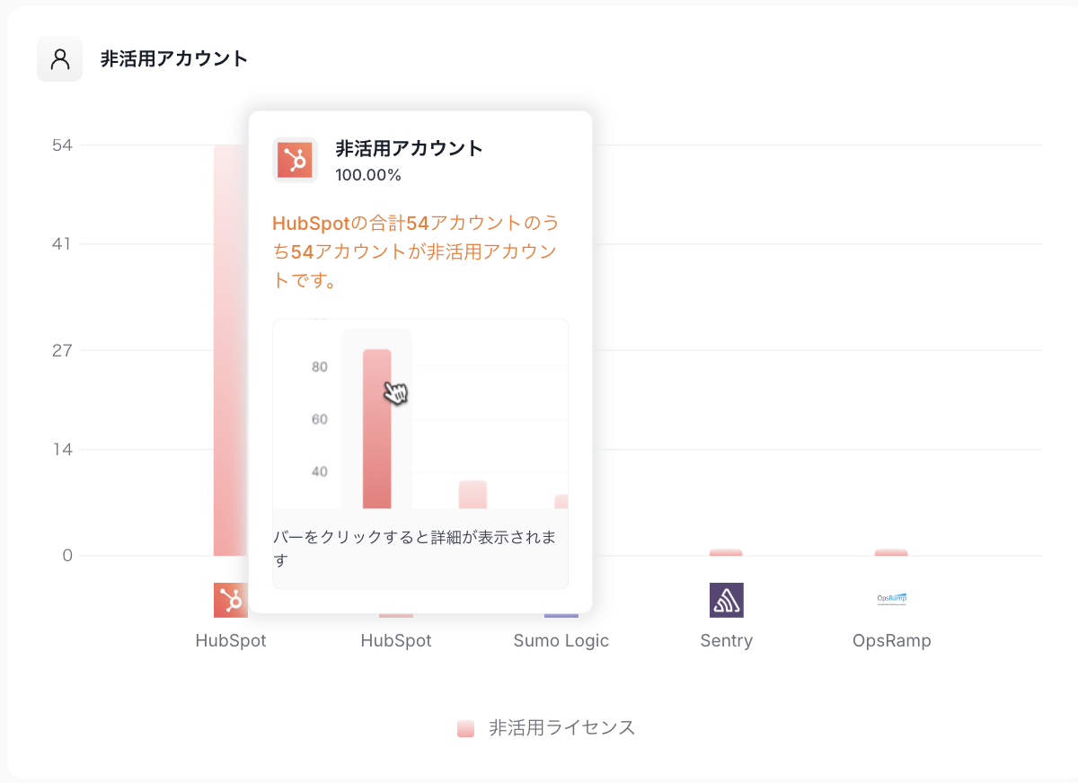 2) 非活用アカウント :このグラフは、利用率の低い、または未使用のライセンスを持つアカウントの数を示しています。表示されているグラフのバーにマウスポインターを合わせると、利用率の低いアカウントの正確な数を確認できます。