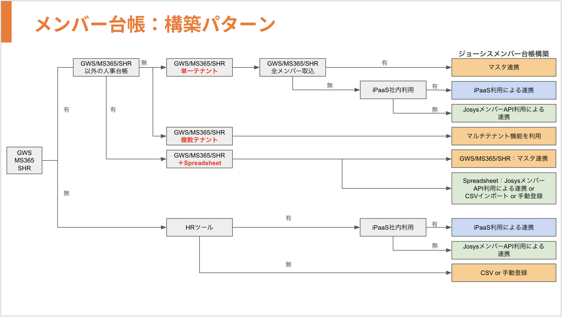 メンバー台帳の作成方法は、外部システム(Google Workspace/Microsoft365 (Entra ID)/SmartHR)とのマスタ連携、CSVアップロード、手動登録、JosysメンバーAPI利用、iPaaS製品の利用による作成が可能です。