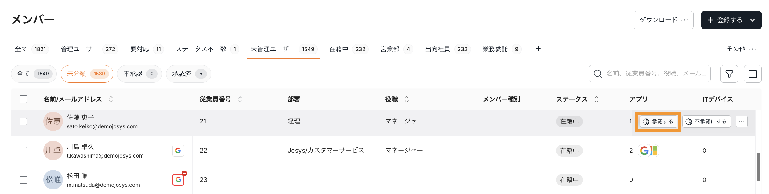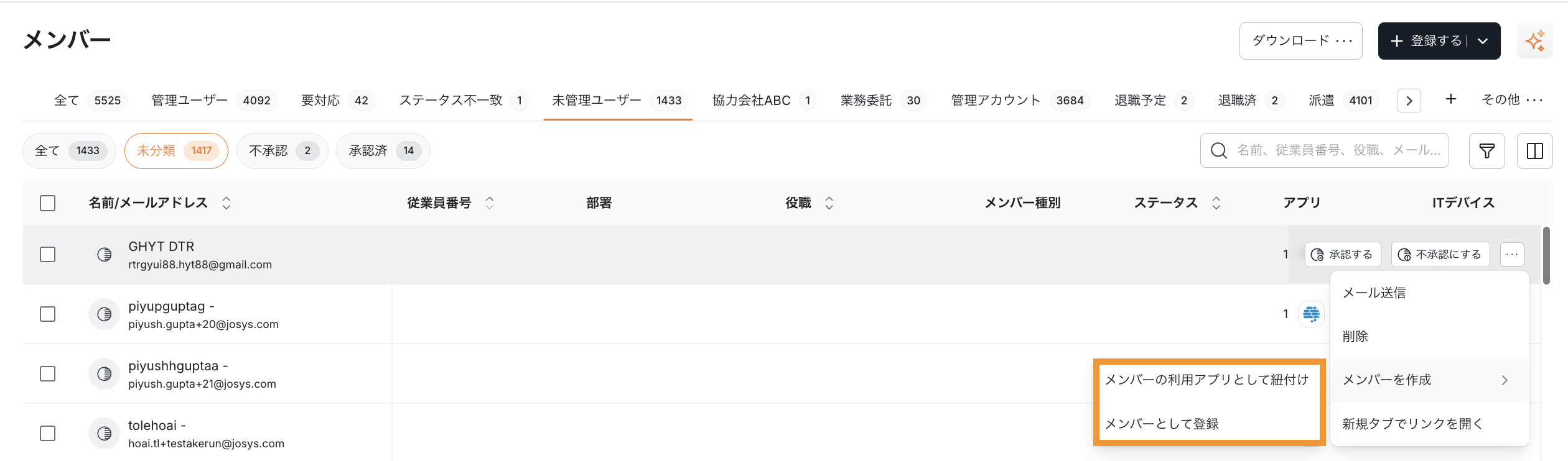 - メンバータブから直接未管理ユーザーの操作を行う新しいアクション機能を追加しました。「新規メンバーとして登録」と「メンバーの利用アプリとして紐付け」を、詳細画面に移動することなく実行できます。