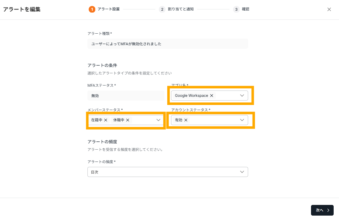 例)キャプチャのように設定をした場合、「在籍中か休職中であり、かつ、対象アプリ(キャプチャの例だとGoogle Workspace)のアカウントを利用中のメンバーがMFAを無効化した場合」、当該アラートが指定の通知先に送られます。
