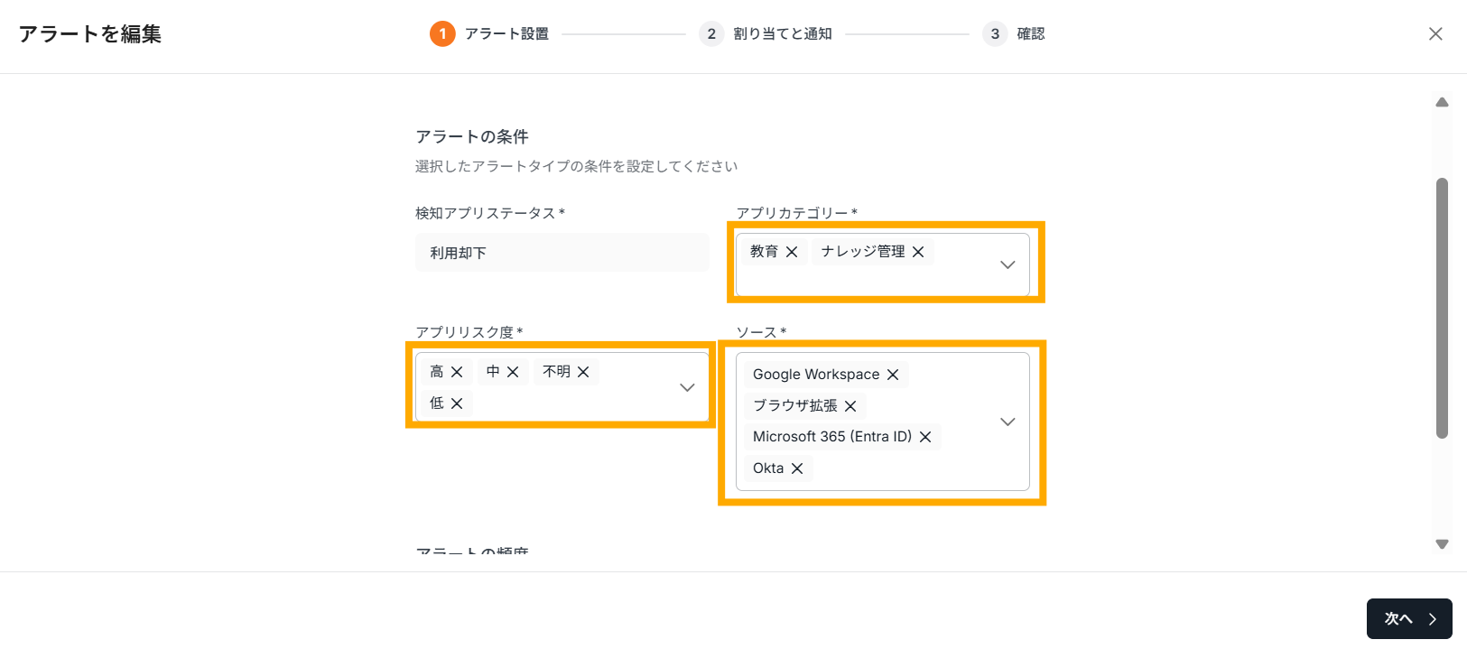 例)キャプチャのように設定をした場合、「初めて利用を検知したアプリの中で、アプリカテゴリーが”教育”か”ナレッジ管理”、かつ、アプリリスク度が低~高/不明のものを、選択したソースのどれかで検知した場合」、当該アラートが指定の通知先に送られます。