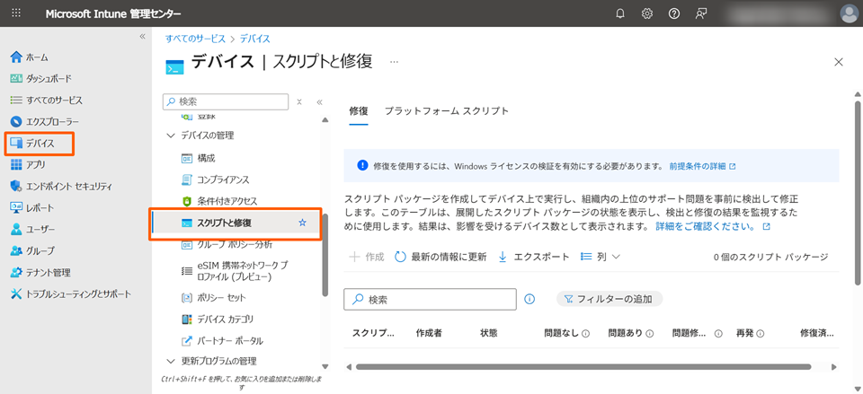 - 「デバイス」>「スクリプトと修復」を開きます。
