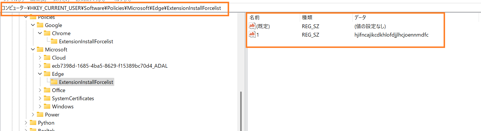 HKEY_CURRENT_USER\SOFTWARE\Policies\Microsoft\Edge\ExtensionInstallForcelist