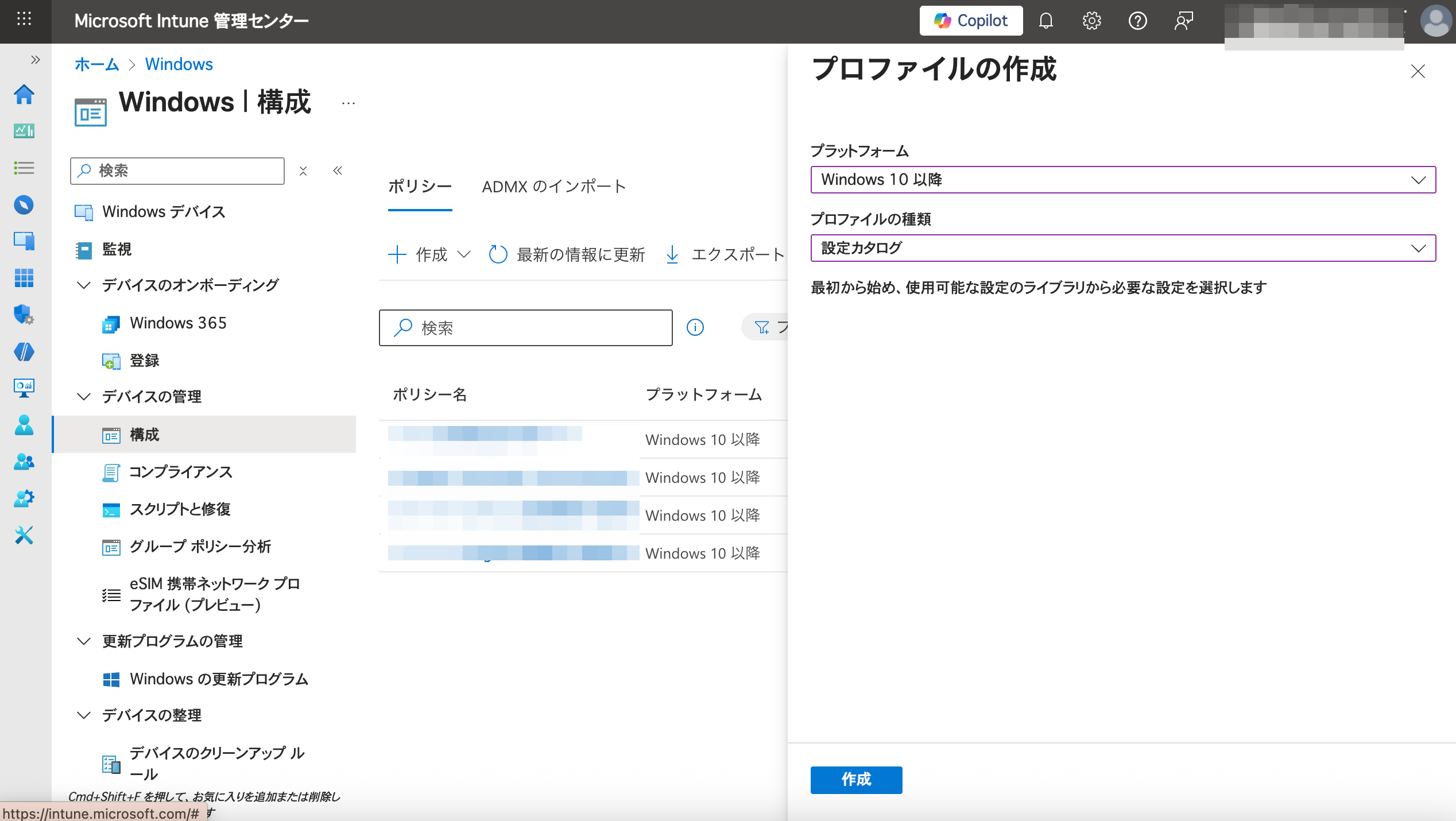 プロファイルの種類:設定カタログ - 入力が完了したら、下部にある「作成」をクリックします。