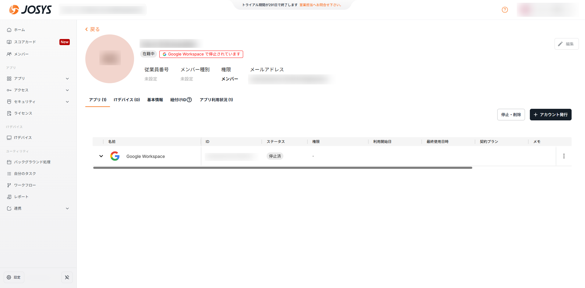 連携しているアプリによっては、Josysから削除/停止ができません。その場合は各アプリ/SaaS側にアクセスして削除・停止を行ってください。