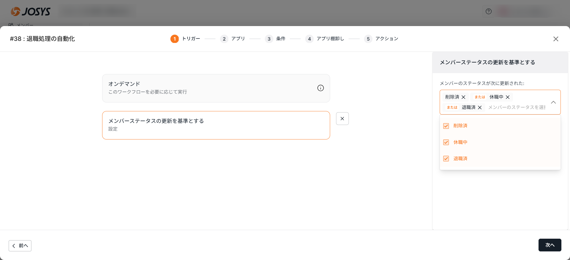 - Josysがアカウントを削除する権限を持っているアプリであれば、トリガーが発動したとともにアカウントを自動的に削除すること