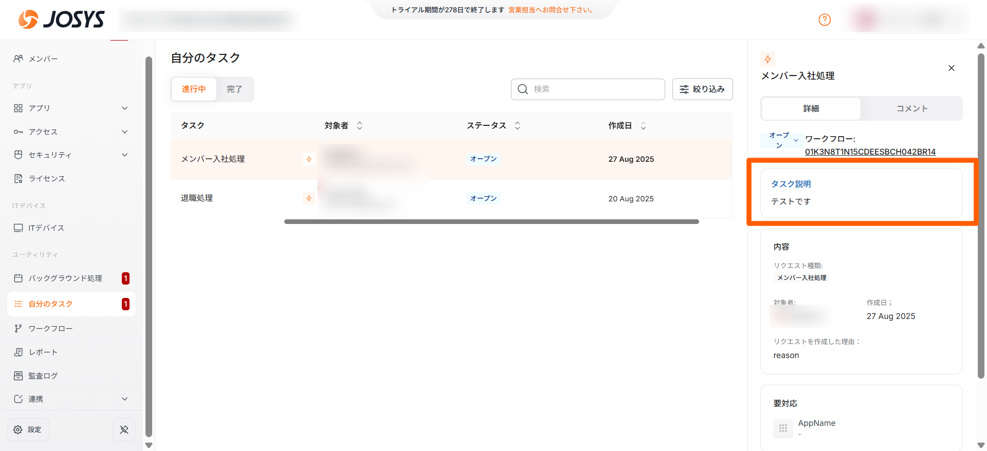 - 未管理ユーザーのメンバー台帳への登録作業をタスクとしてJosys上に登録すること